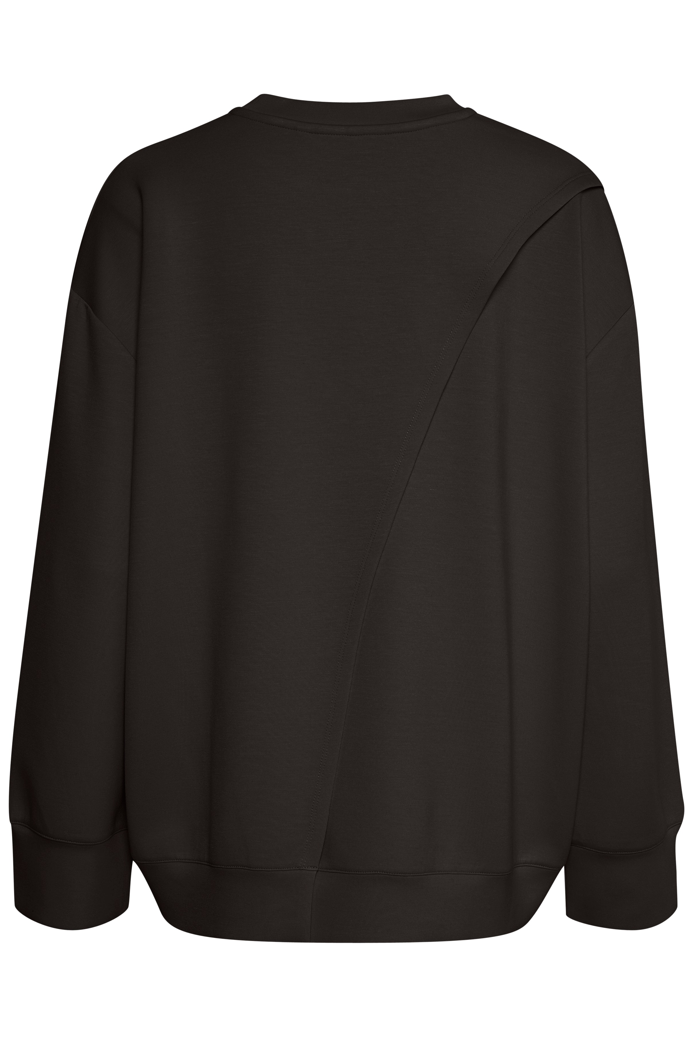 Sort crewneck med rund hals, ribkant på ærmerne, i bunden samt ved halsudskæringen. Blusen har et splitdetalje på ryggen. Modellen er 177 cm og er iført en str. S.
