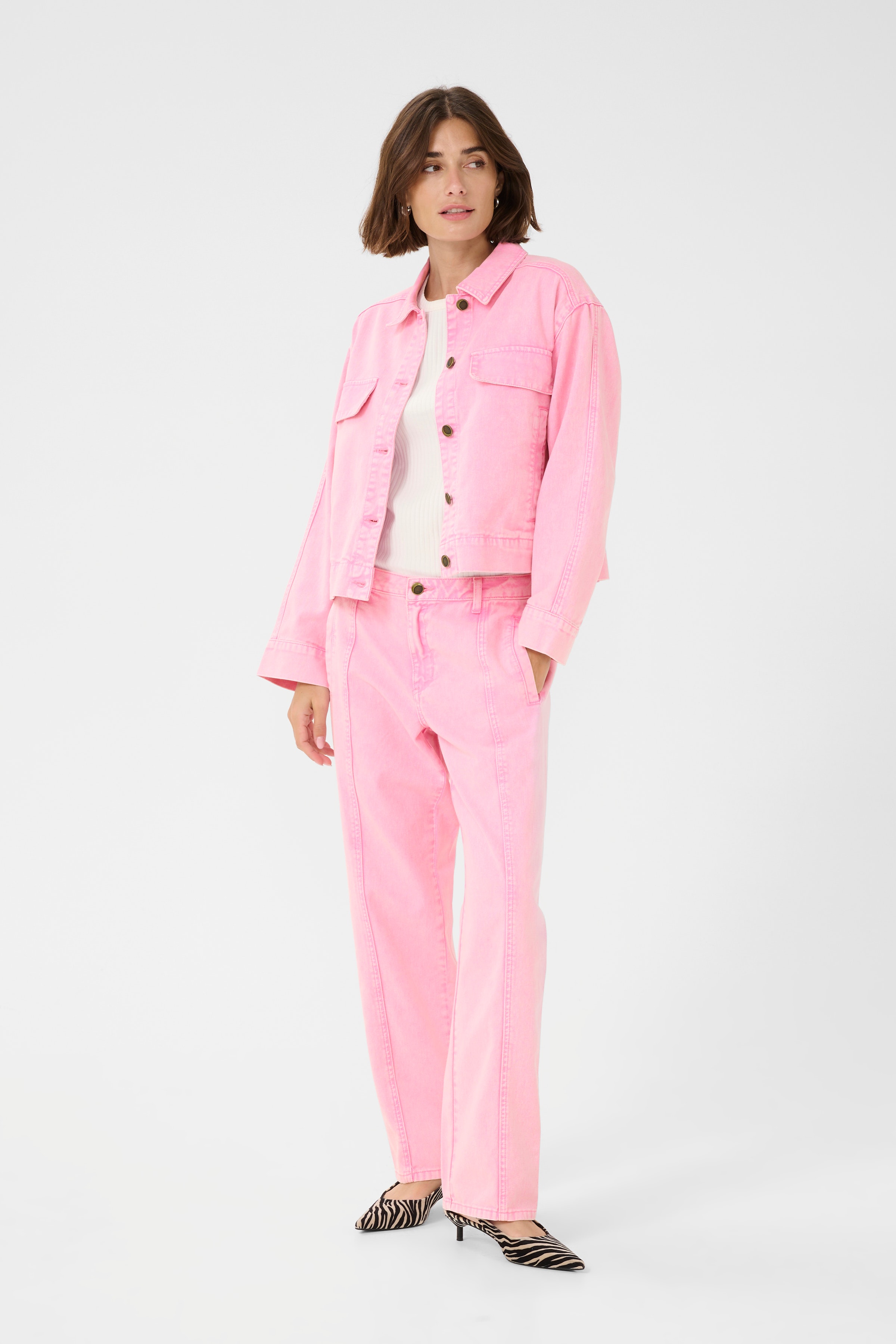 Kort denimjakke med vasket finish og moderne detaljer. Jakken har klaplommer foran, skjulte sidelommer og en markant læg bagpå, som giver ekstra bevægelighed. Modellen er 175 cm høj og bærer en størrelse 38.
