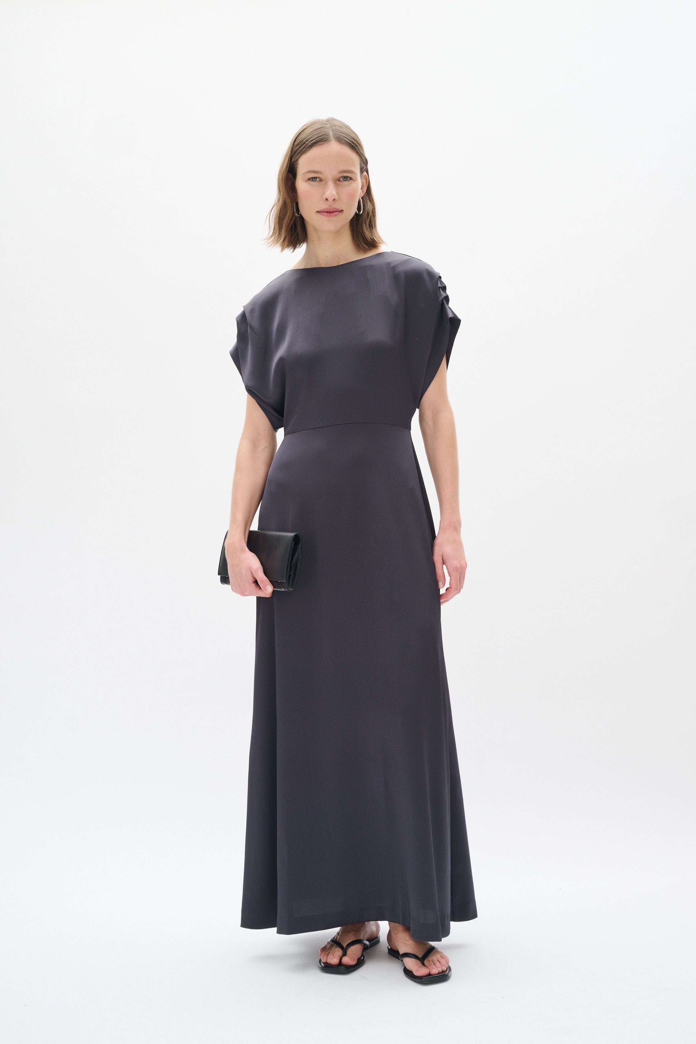 Maxikjole med glat, let skinnende finish. Lige silhuet, rund halsudskæring og løse capærmer med diskret rynkning på skuldrene. Syning i taljen giver markeret form.