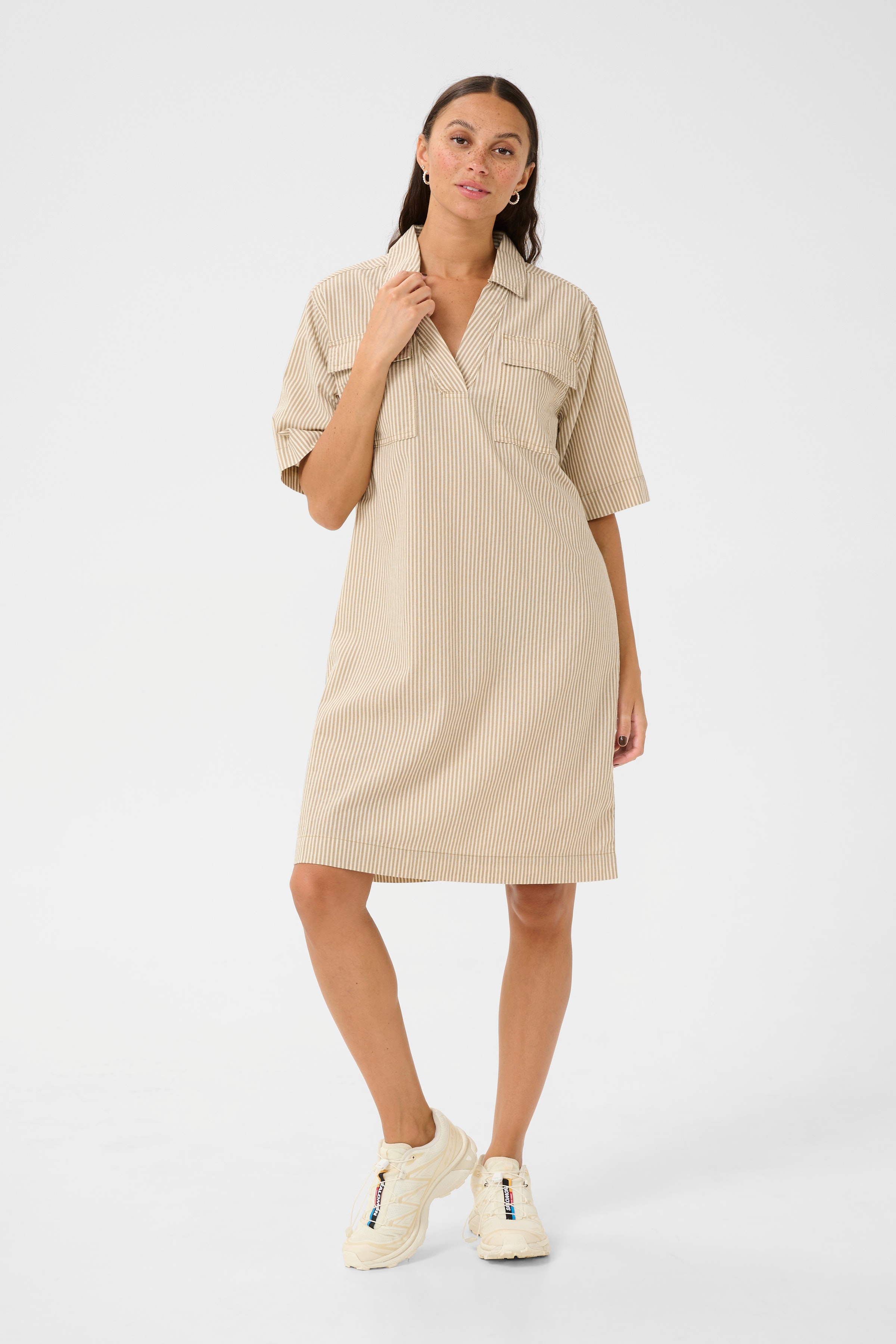 Et par stiletter eller sneakers, strømpebukser eller jeans, skuldertaske eller ej. Mulighederne er mange og ofte kræver det ikke mere for at ændre et look fuldstændig. Netop sneakers og en flot kjole, lang eller kort, er et look, der kan bruges til næsten alle anledninger. Du ender med et casual, men stilfuldt look, der kan bæres af stort set alle.