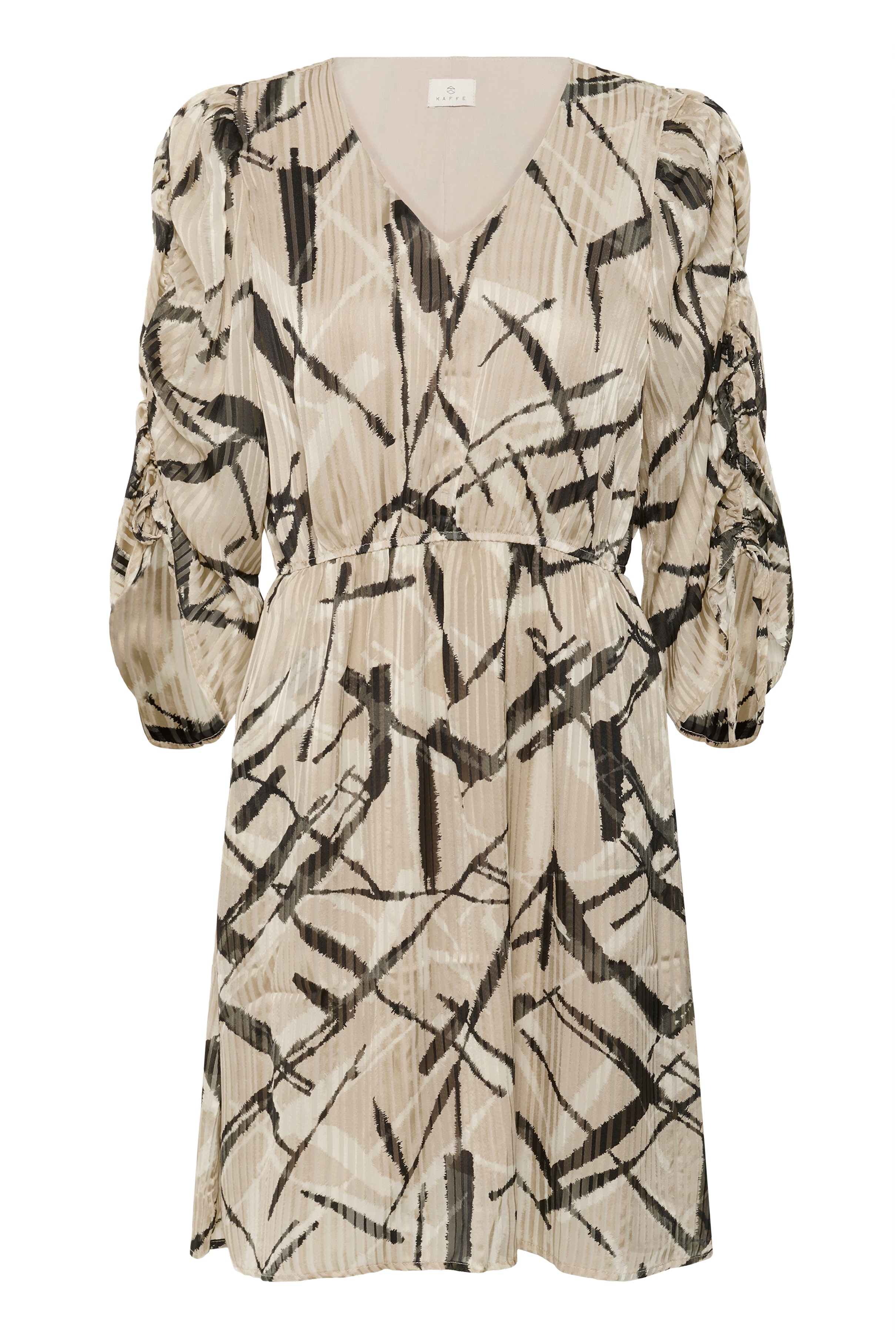 Knælængde kjole med moderne abstrakt mønster, V-udskæring, voluminøse trekvartærmer og blød plisseret struktur. Let udsvinget silhuet og rynkede ærmedetaljer giver et nutidigt udtryk.