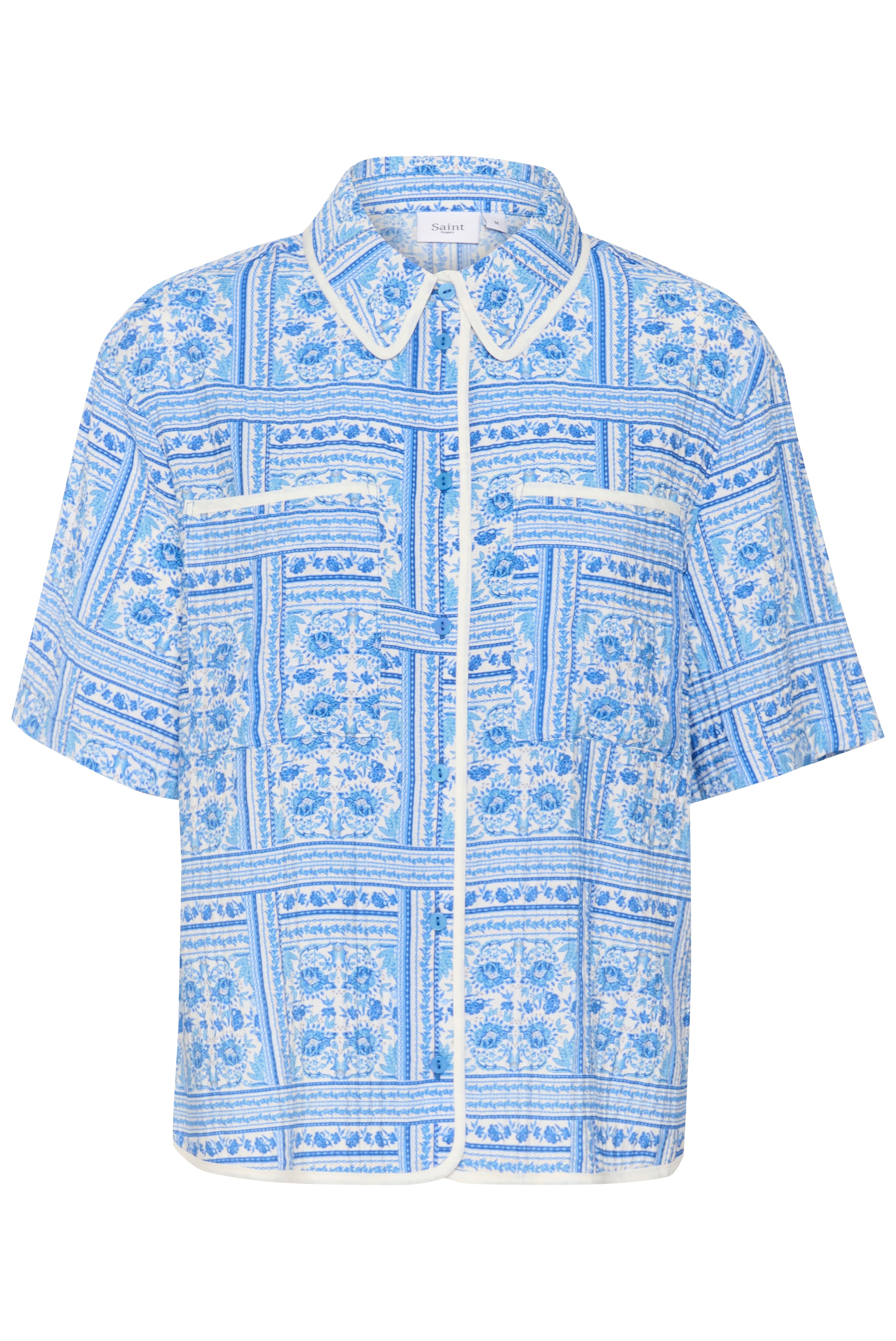 Kortærmet skjorte i lyseblå med hvidt mosaikprint. Løs pasform med brystlomme, krave og knapper foran. Let kvalitet med blødt fald – kan bæres alene eller som sæt. Modellen er 179 cm høj og iført en str. S.