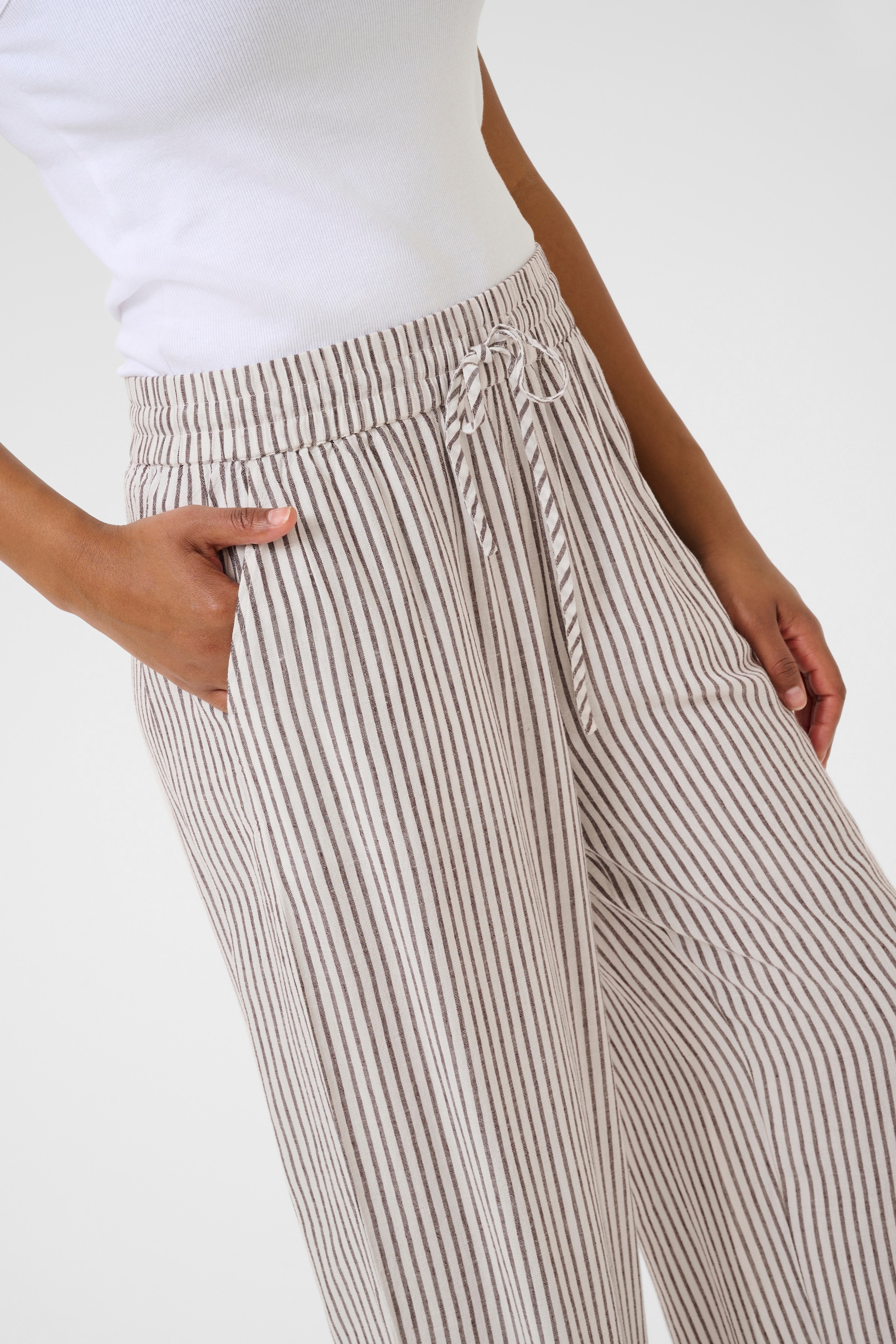 Stribede bukser med afslappet, bred pasform og ankellang længde. Elastisk linning og justerbar bindedetalje giver komfort i et let og åndbart materiale.