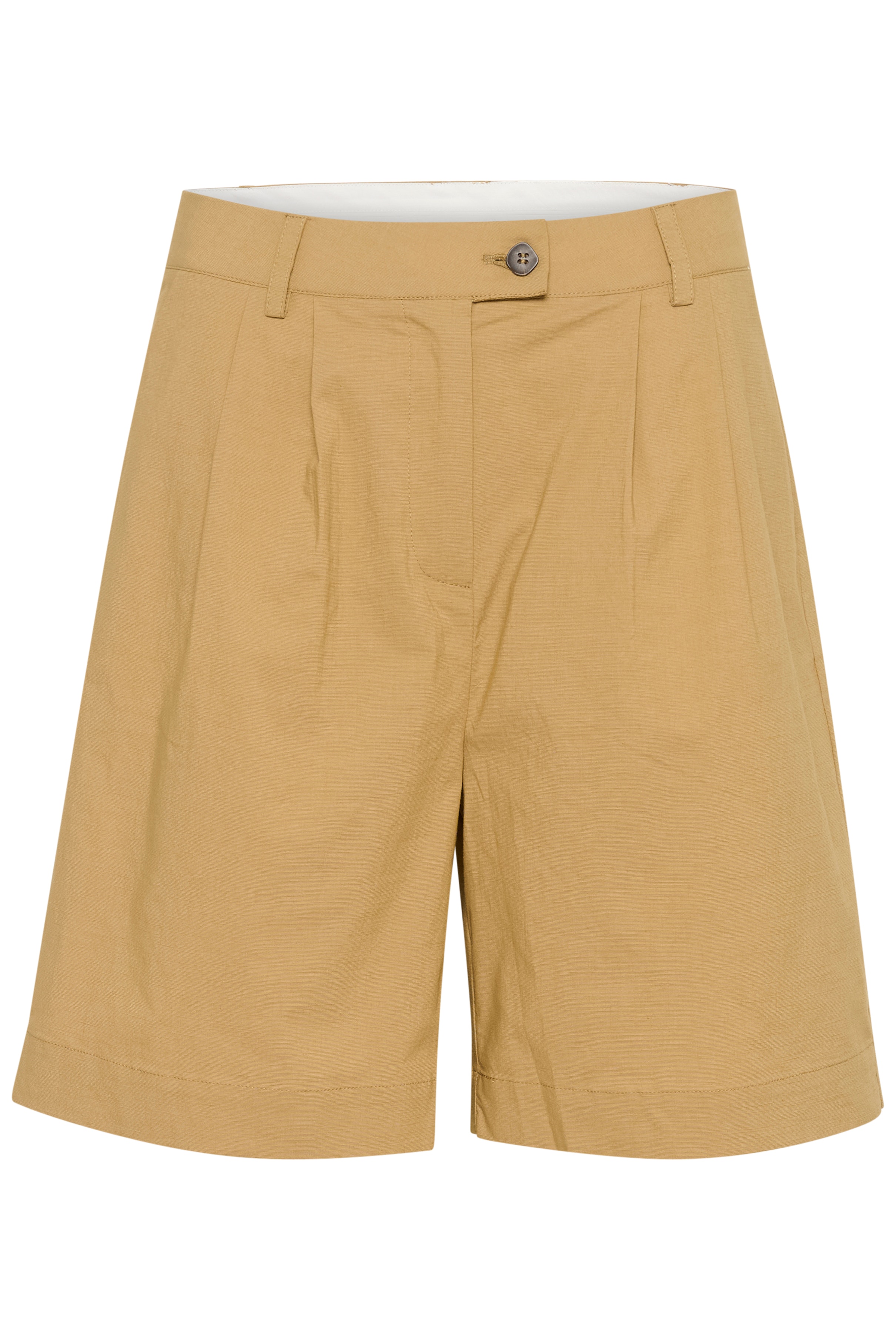 Skræddersyede shorts i en lys kakifarve med vævet struktur. Designet med læg foran, bæltestropper og lukning med knap og lynlås. Mellemlange med et struktureret men behageligt fit. Modellen er 175 cm høj og har størrelse S på.