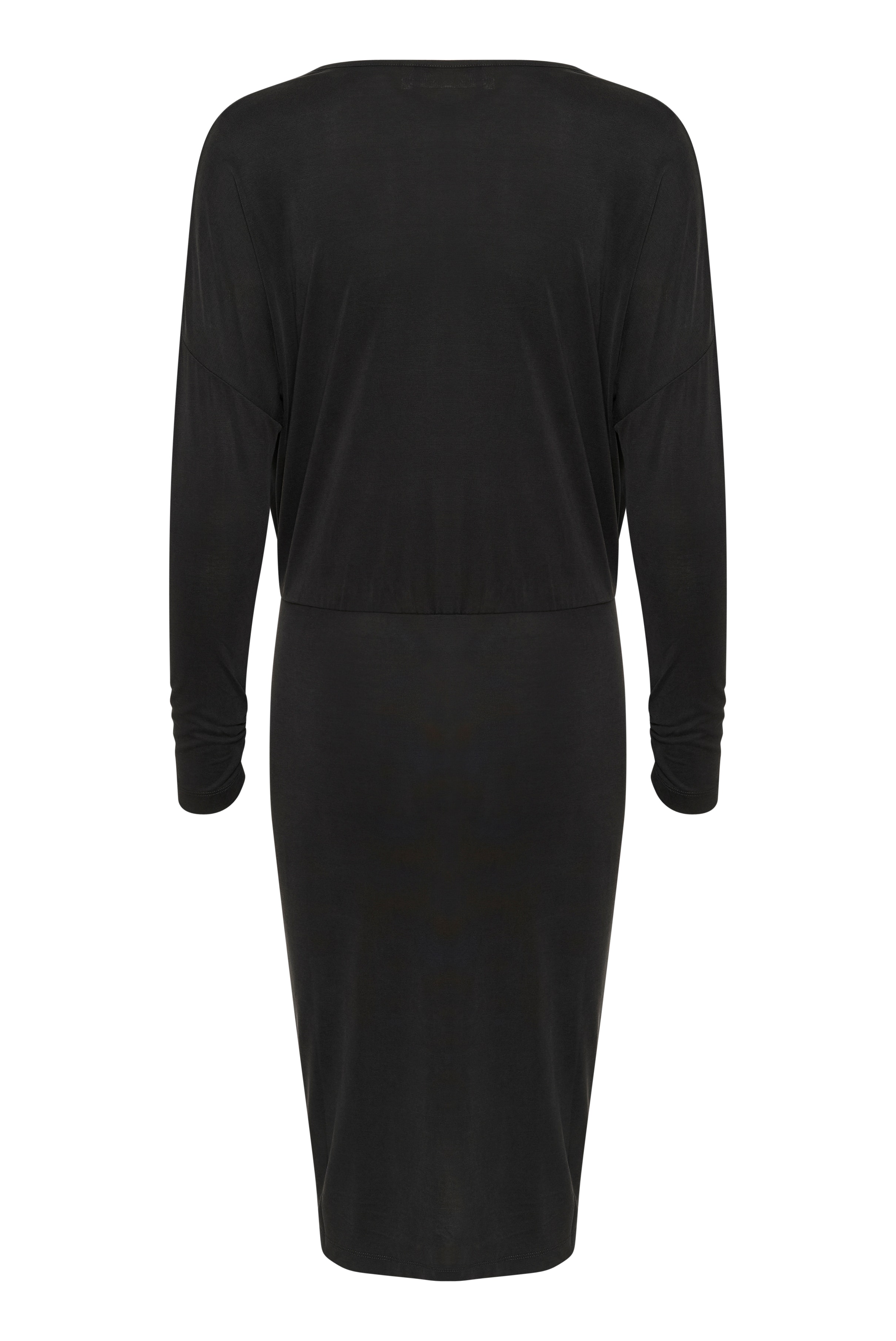 Kjole med afslappet boatneck, lange ærmer og lige pasform. Rynkedetalje ved taljen og overlappende tulipanformet underdel for moderne udtryk.