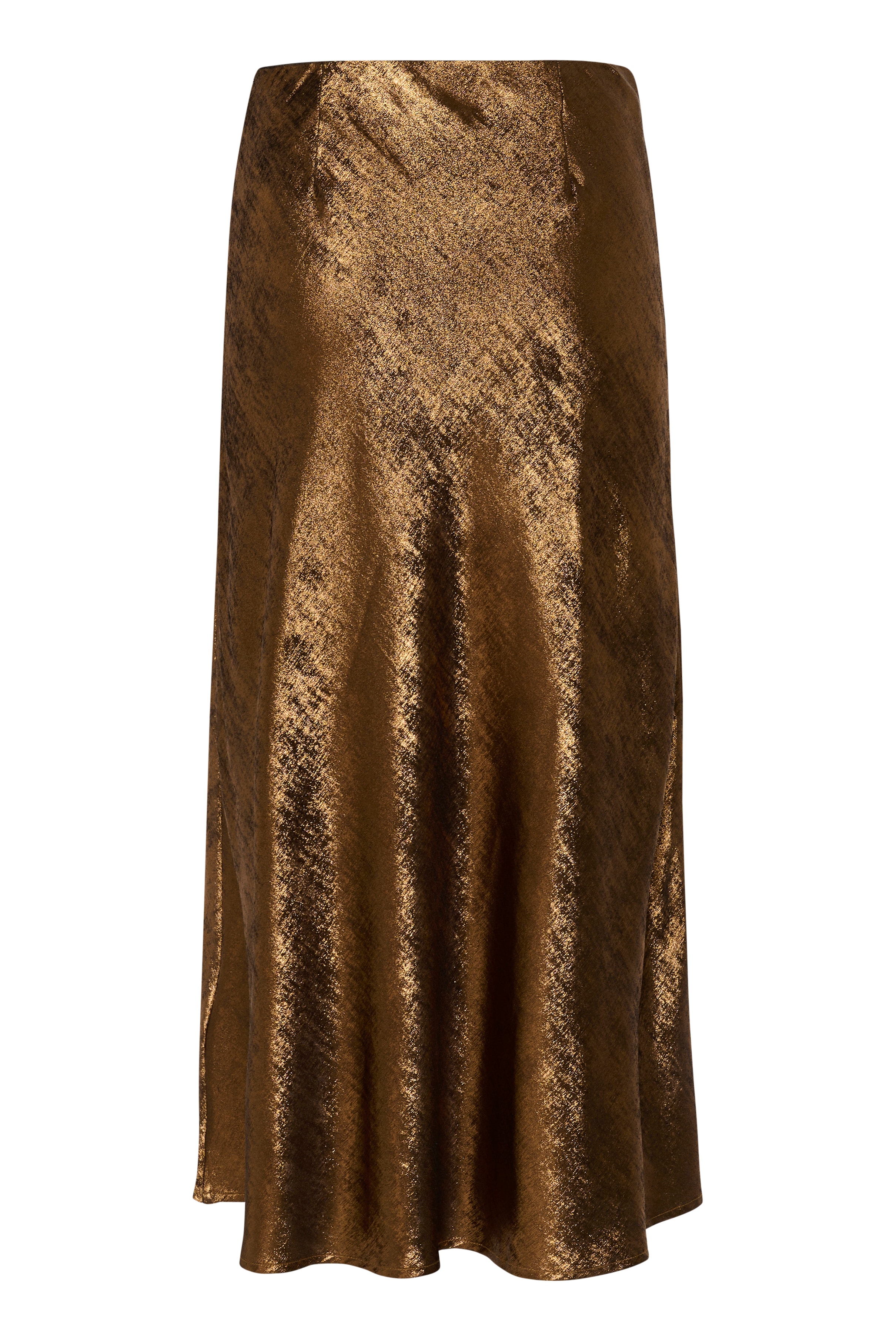 Denne lange nederdel i bronze har en glansfuld, metallisk finish. Det elegante og flydende snit giver et smukt fald og en luksuriøs fornemmelse, perfekt til festlige lejligheder. Modellen er 176 cm høj og bærer størrelse S.