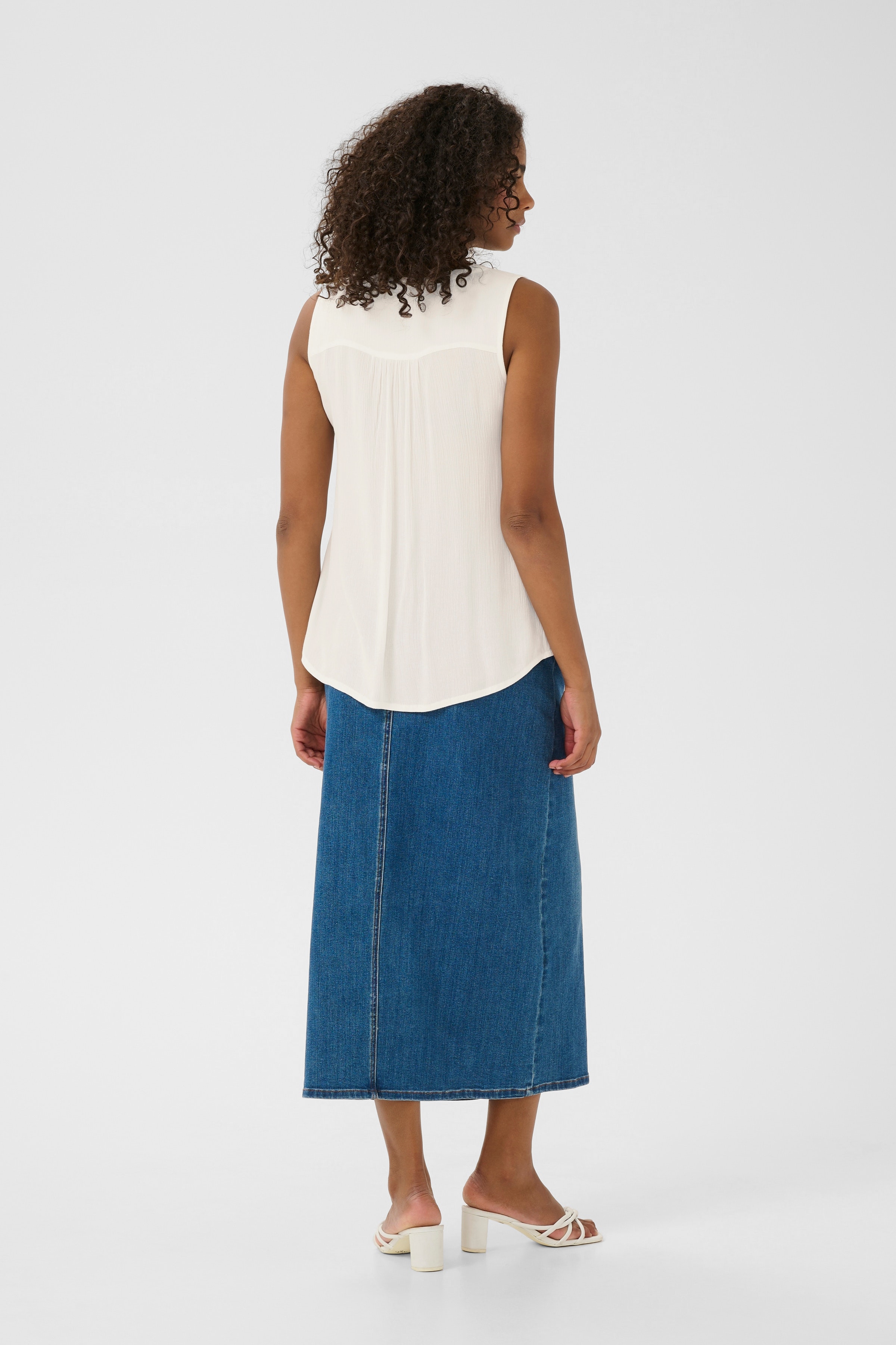 Ein ärmelloses Oberteil mit geradem Schnitt, tiefer V-Ausschnitt und breiter Blende. Die feine, leicht transparente Struktur verleiht moderne Leichtigkeit.