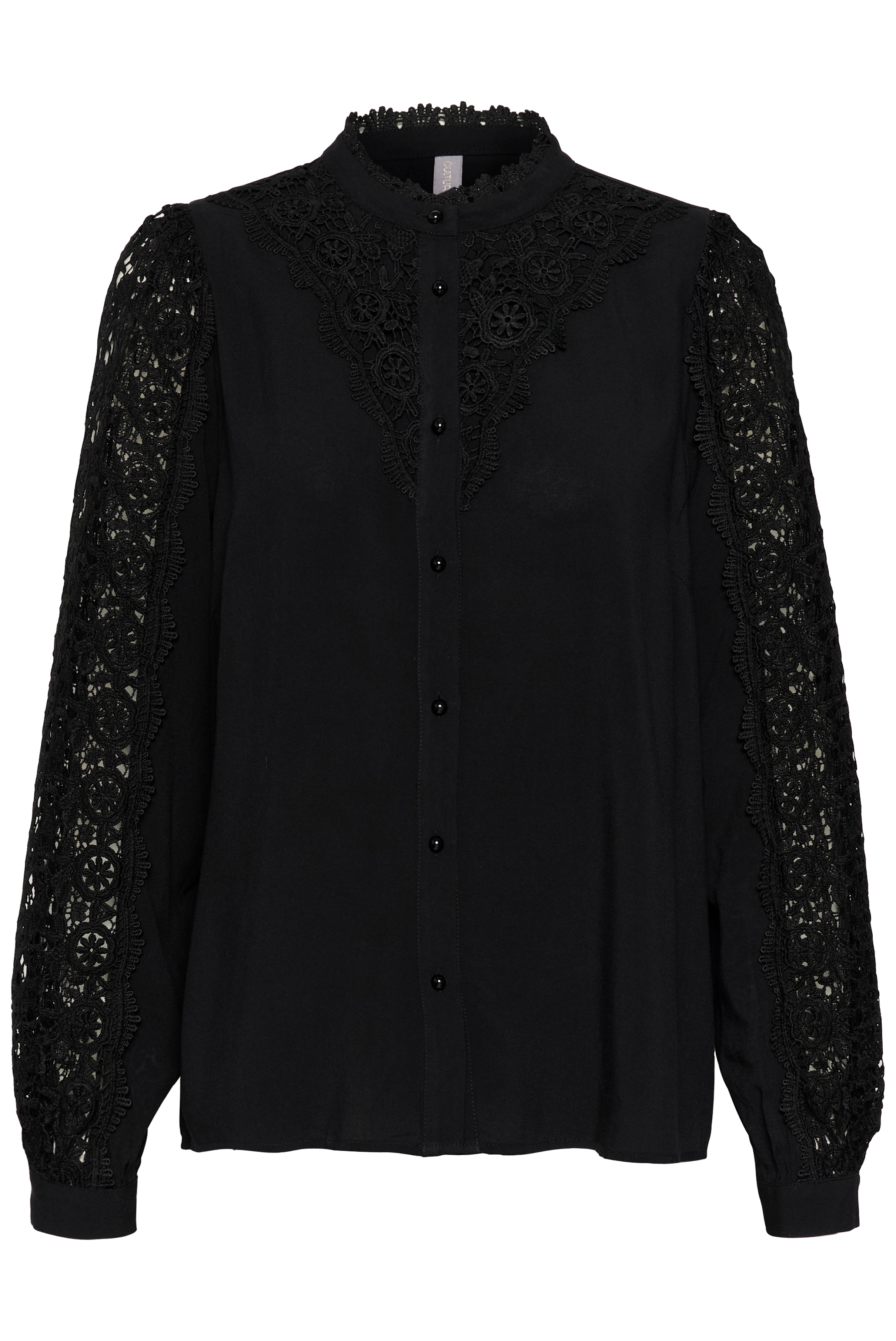 Bluse mit lockerem Schnitt, feinen Spitzendetails an Ärmeln und Brust, Stehkragen sowie Knopfleiste vorn. Dezente Struktur.