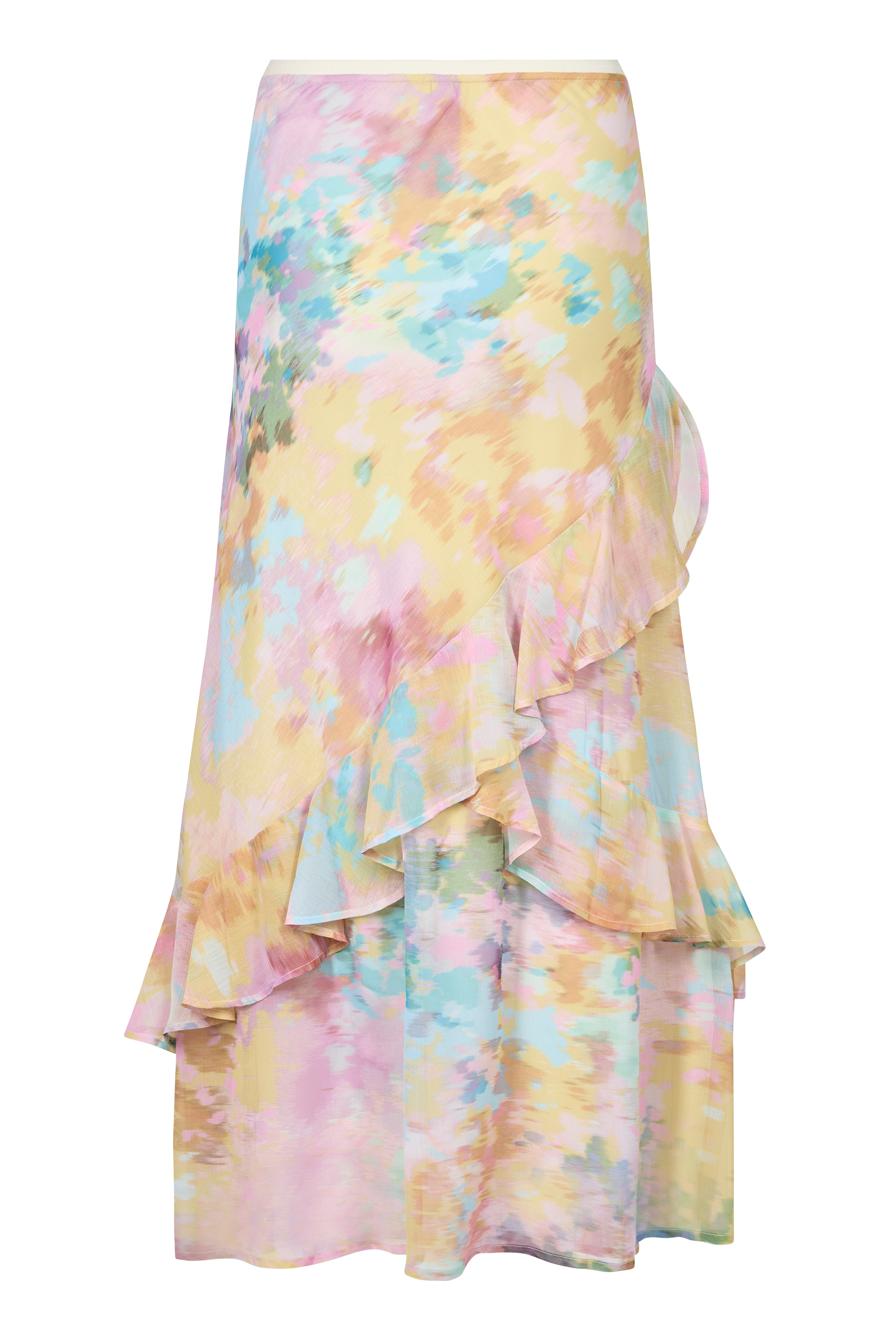 Luftiger Midirock mit asymmetrischer Rüsche und zartem, transparentem Finish. Hohe Taille, leicht ausgestellt und modern interpretiert.