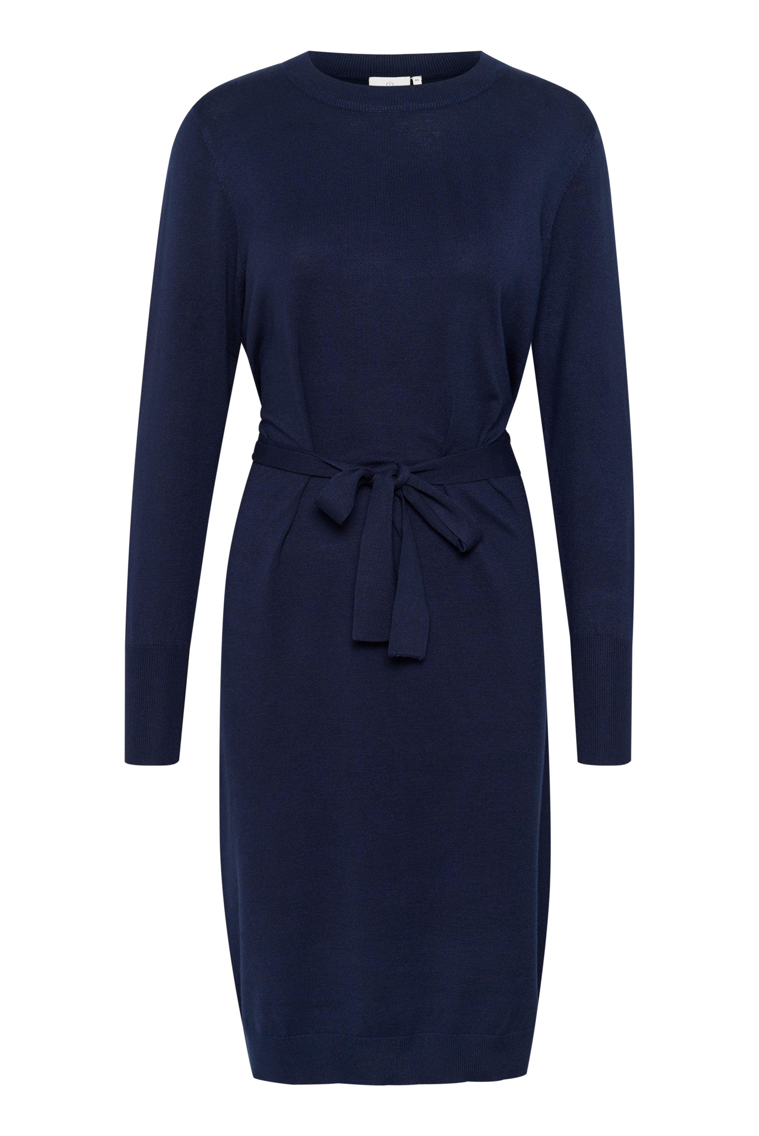 Strickkleid mit geradem Schnitt, Rundhalsausschnitt und langen Ärmeln. Taillengürtel, gerippte Bündchen und Knie-langer Abschluss ergänzen das Design.