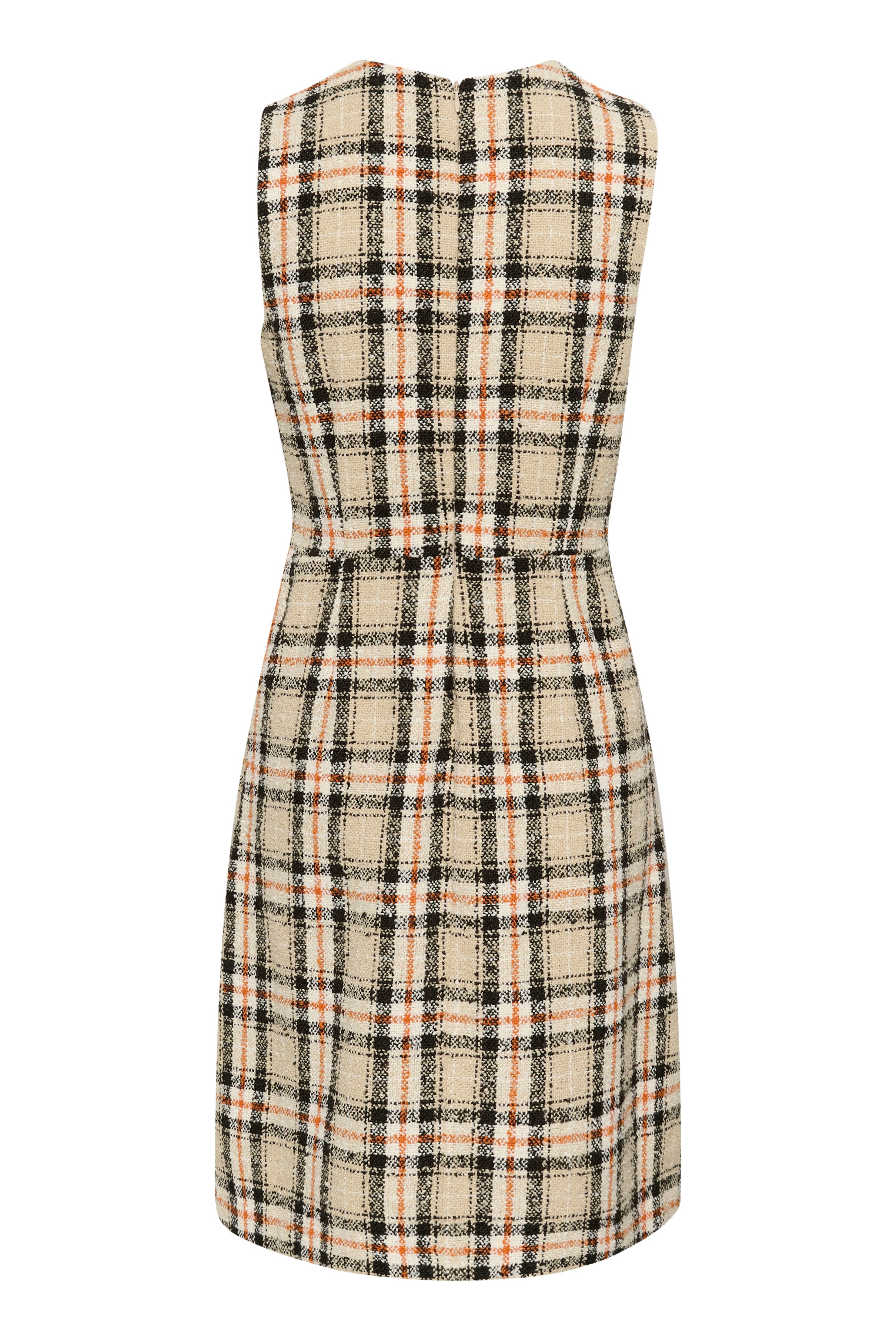 Kariertes Kleid mit Rundhalsausschnitt und verdecktem Reißverschluss hinten. Das Kleid hat eine taillierte Passform und zwei Seitentaschen. Das Model ist 176 cm groß und trägt Größe 36/S.