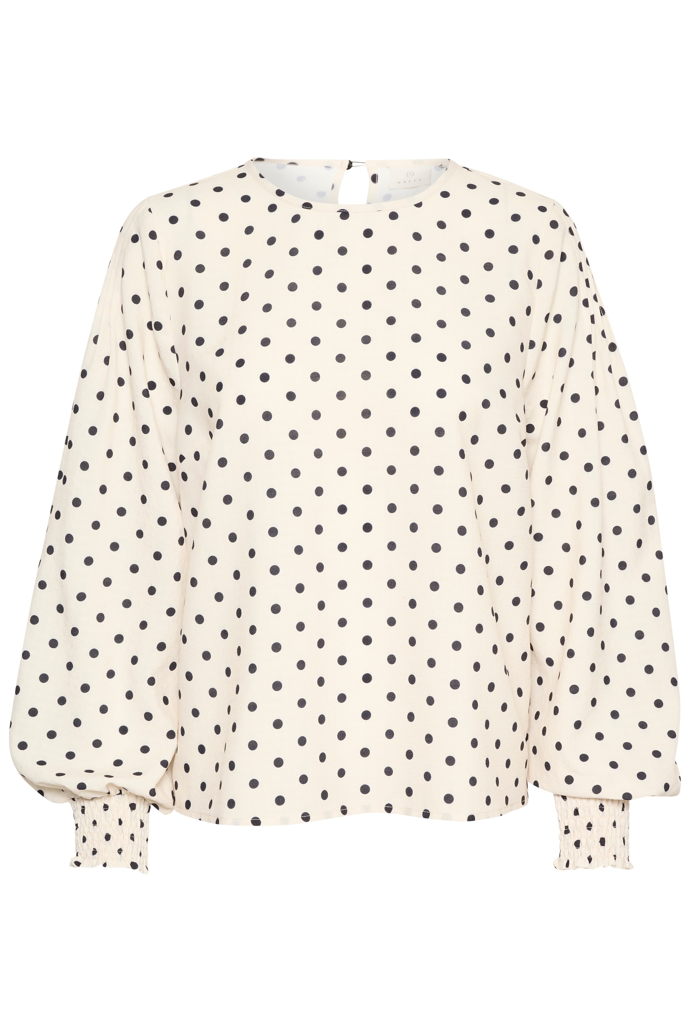 Polka-Dot-Bluse mit geradem Schnitt, rundem Ausschnitt und weiten, langen Ärmeln mit breiten, gesmokten Bündchen. Dezenter Knopfverschluss hinten.