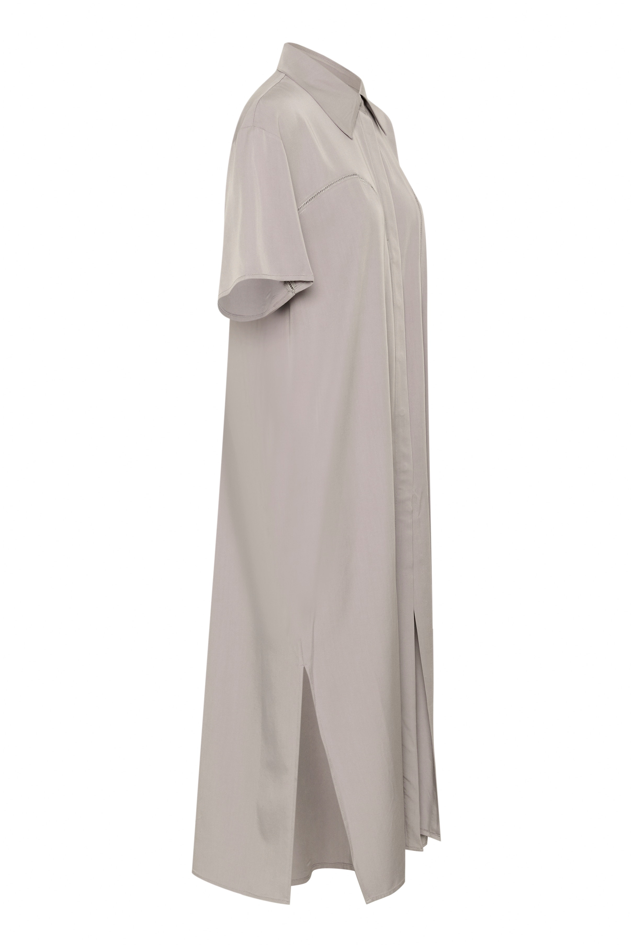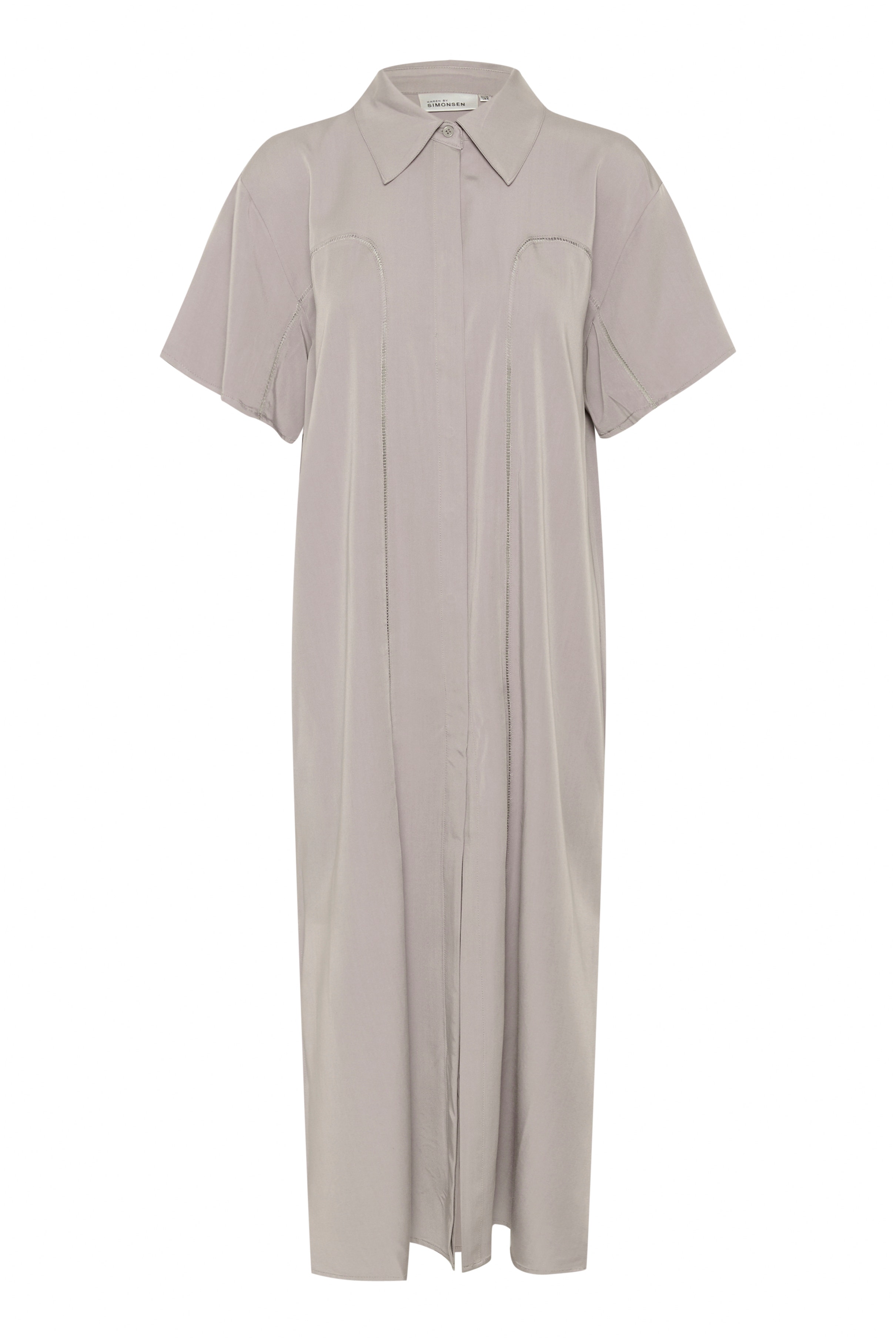 Langes Hemdblusenkleid mit kurzen Ärmeln, klassischem Kragen und Kontrastnähten. Die lockere Silhouette sorgt für einen eleganten und lässigen Look. Das Model ist 177 cm groß und trägt Größe 36/S.