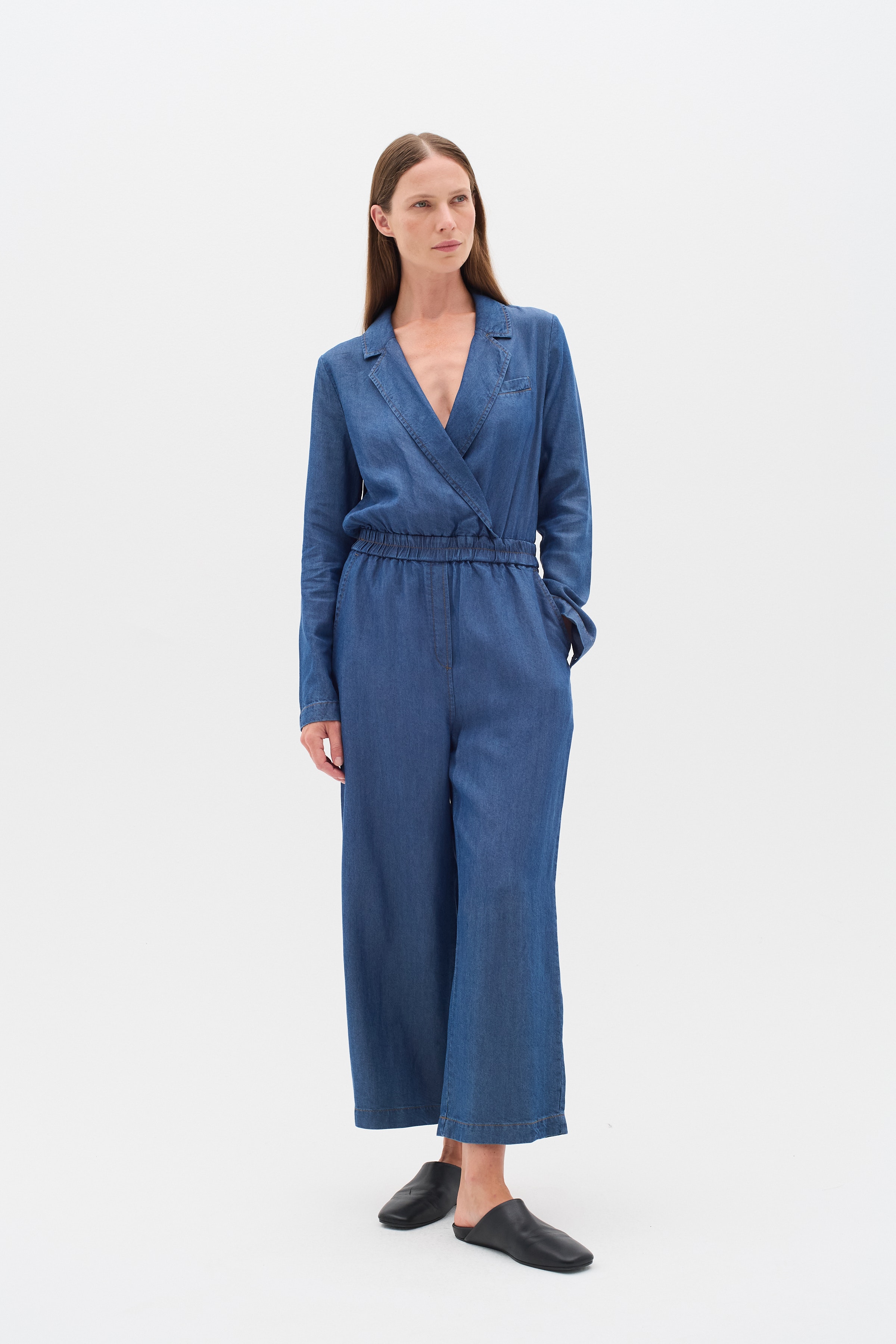 Jumpsuit aus weichem, gewaschenem Denim in sattem Blau. Mit Wickeloptik und V-Ausschnitt, langen Ärmeln sowie elastischer Taille mit Bindegürtel. Weit geschnittene Beine und schräge Eingrifftaschen runden das Design ab. Das Model ist 176 cm groß und trägt Größe 36/S.