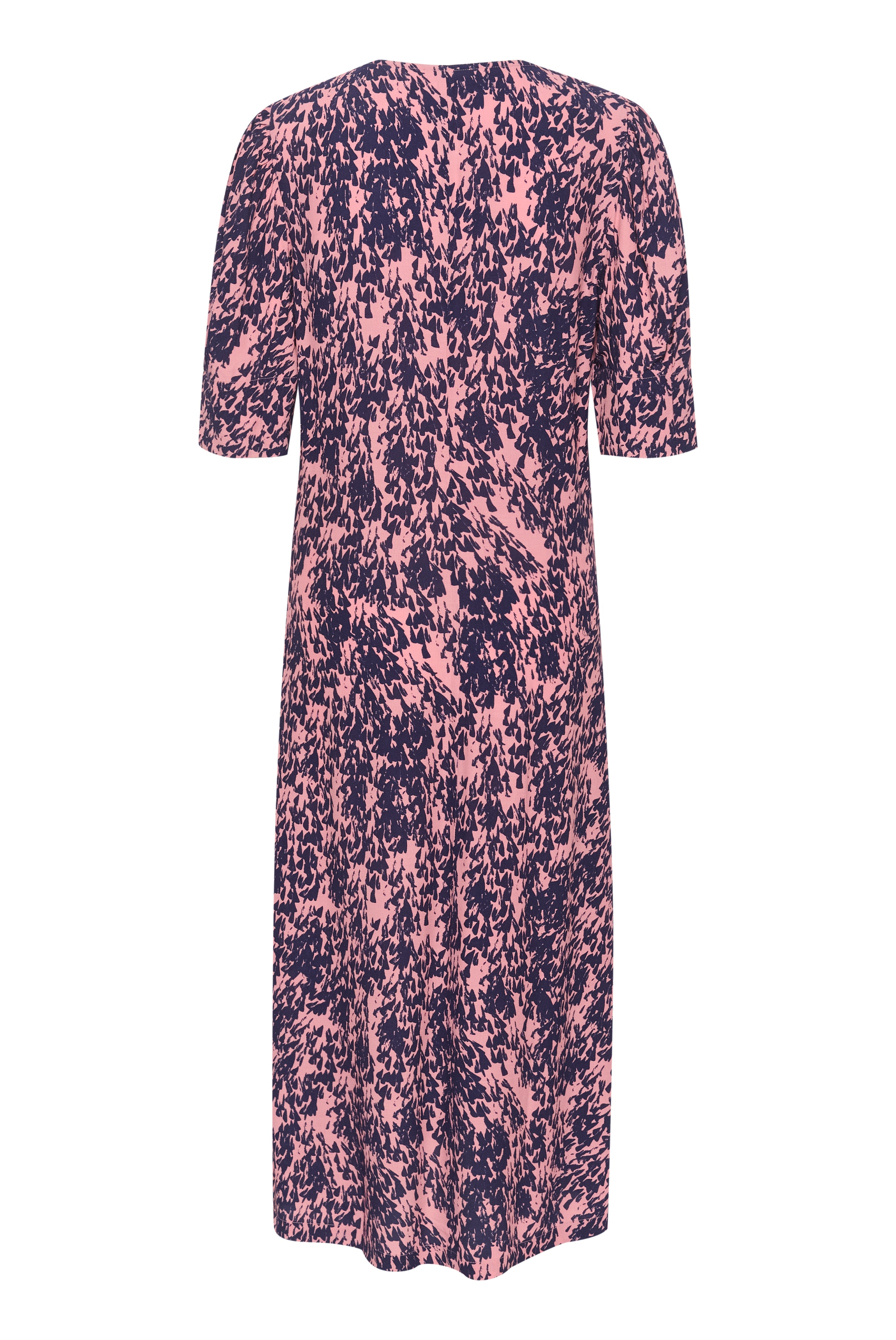 Bedrucktes Kleid mit V-Ausschnitt, Ballonärmeln und normaler Passform. Das Kleid hat ein Rüschendetail vorne, das eine schöne Silhouette schafft. Das Model ist 176 cm groß und trägt Größe M.