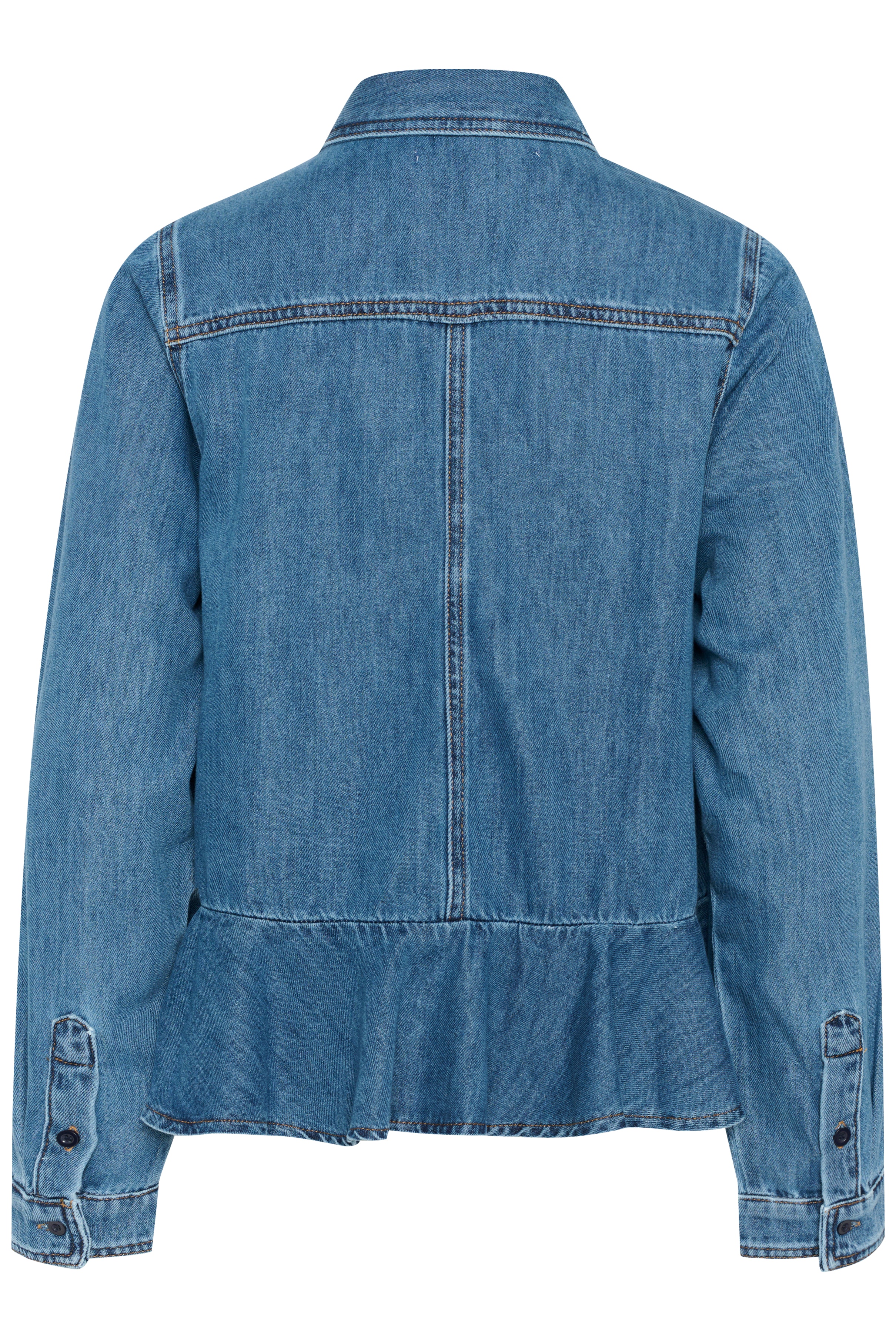 Feminines Jeanshemd mit Volant-Detail am Saum und verdeckter Knopfleiste. Mit klassischem Kragen, langen Ärmeln und sichtbaren Nähten für einen stilvollen Look. Hergestellt aus Denim. Das Model ist 176 cm groß und trägt Größe 36/S.