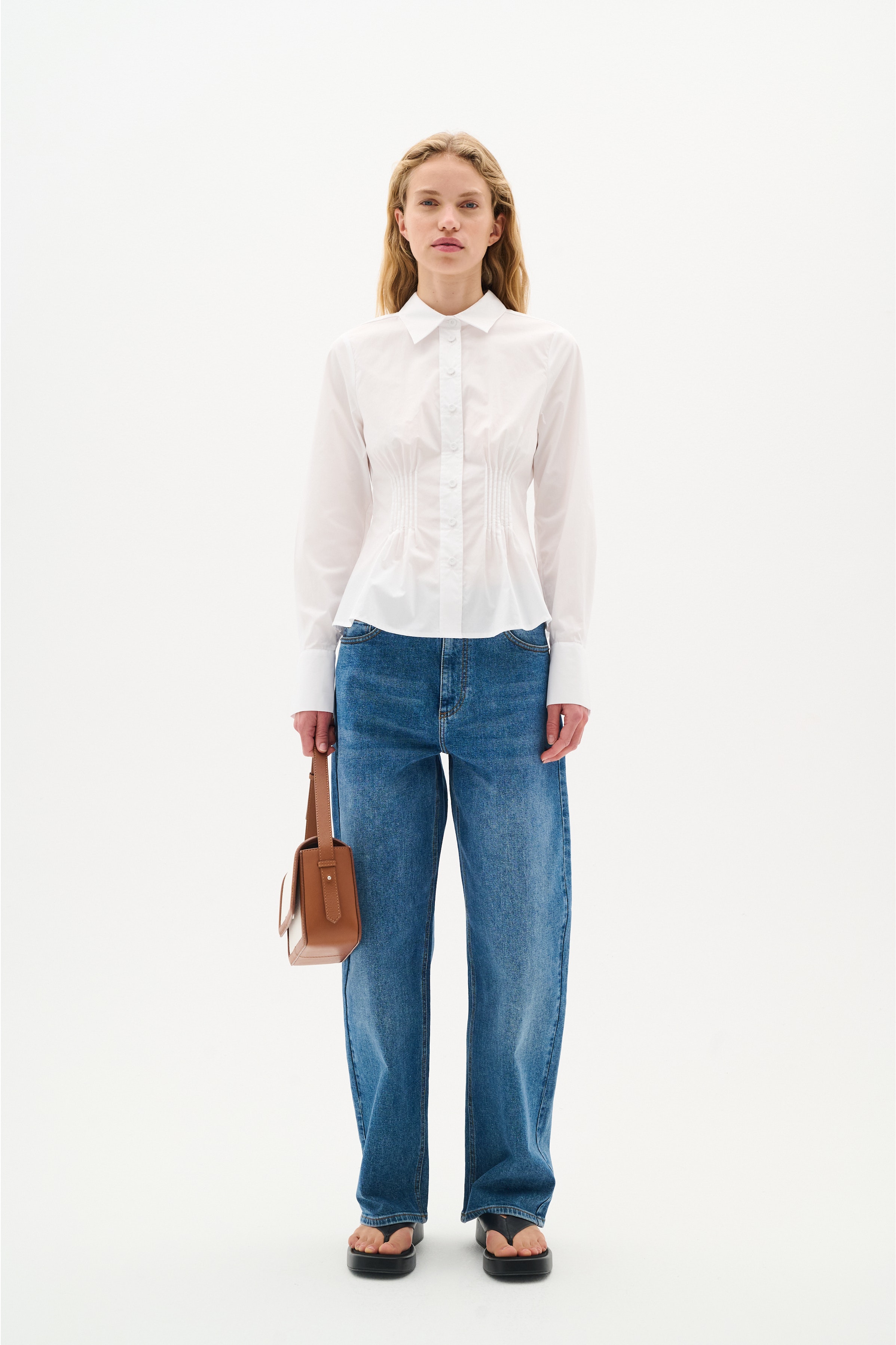 Klassische weiße Bluse aus 100% Baumwolle. Mit langen Ärmeln, Knopfleiste und einem eleganten Kragen. Smock-Details an der Taille zaubern eine feminine Silhouette, während der dezente Peplum-Effekt für Eleganz sorgt. Das Model ist 176 cm groß und trägt Größe 36/S.