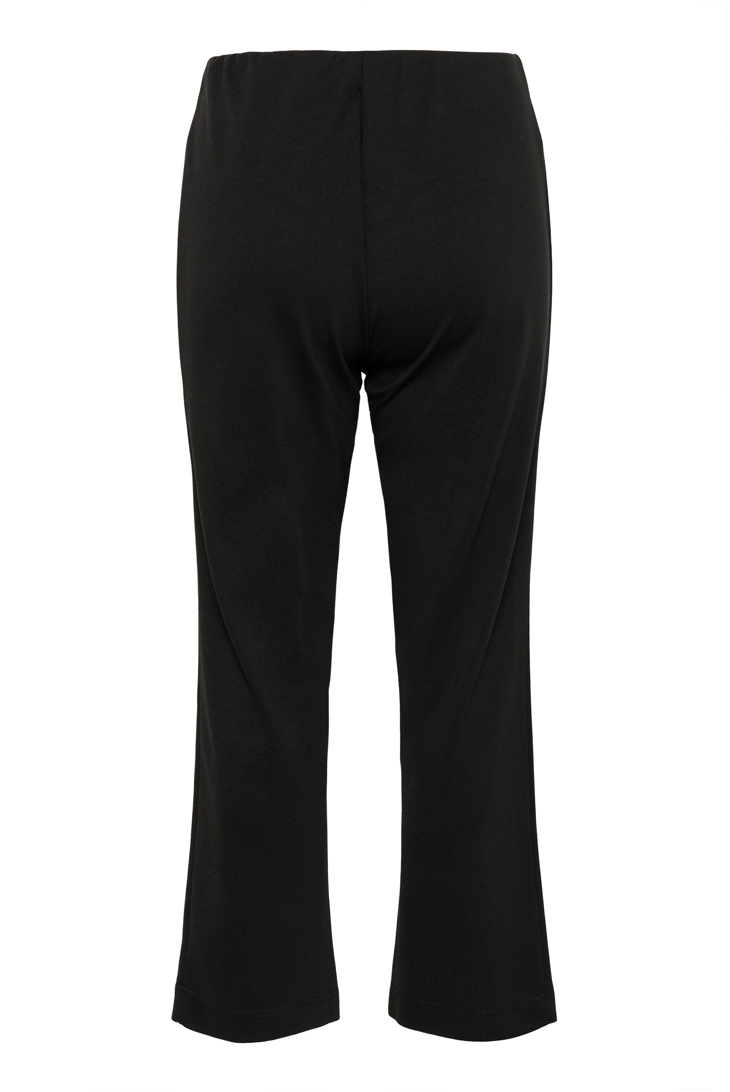 Black ankle trousers in jersey quality with elastic at the waist and press pleats and wide legs, the trousers have a normal fit. Wendy is 176 cm and wears a size M.