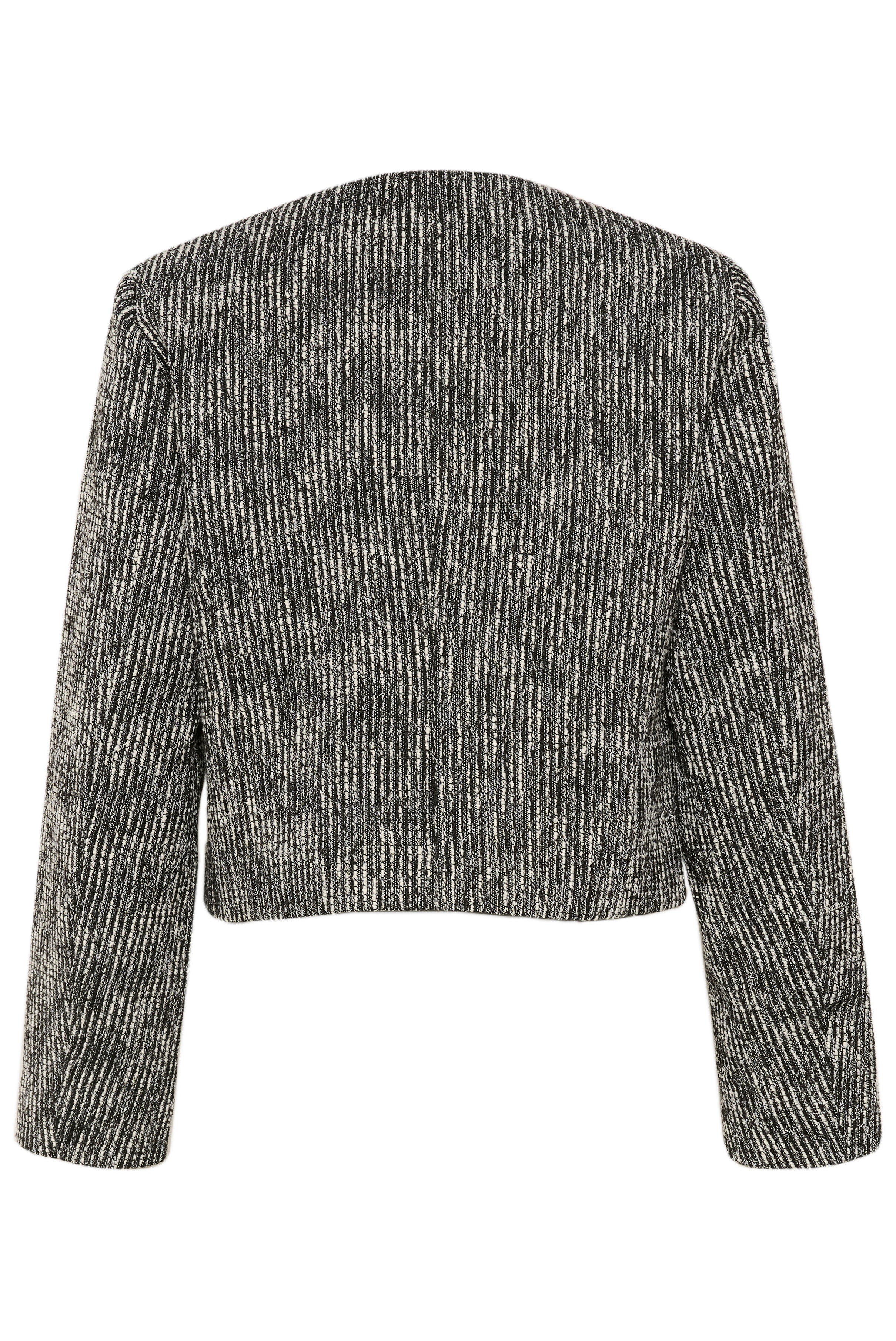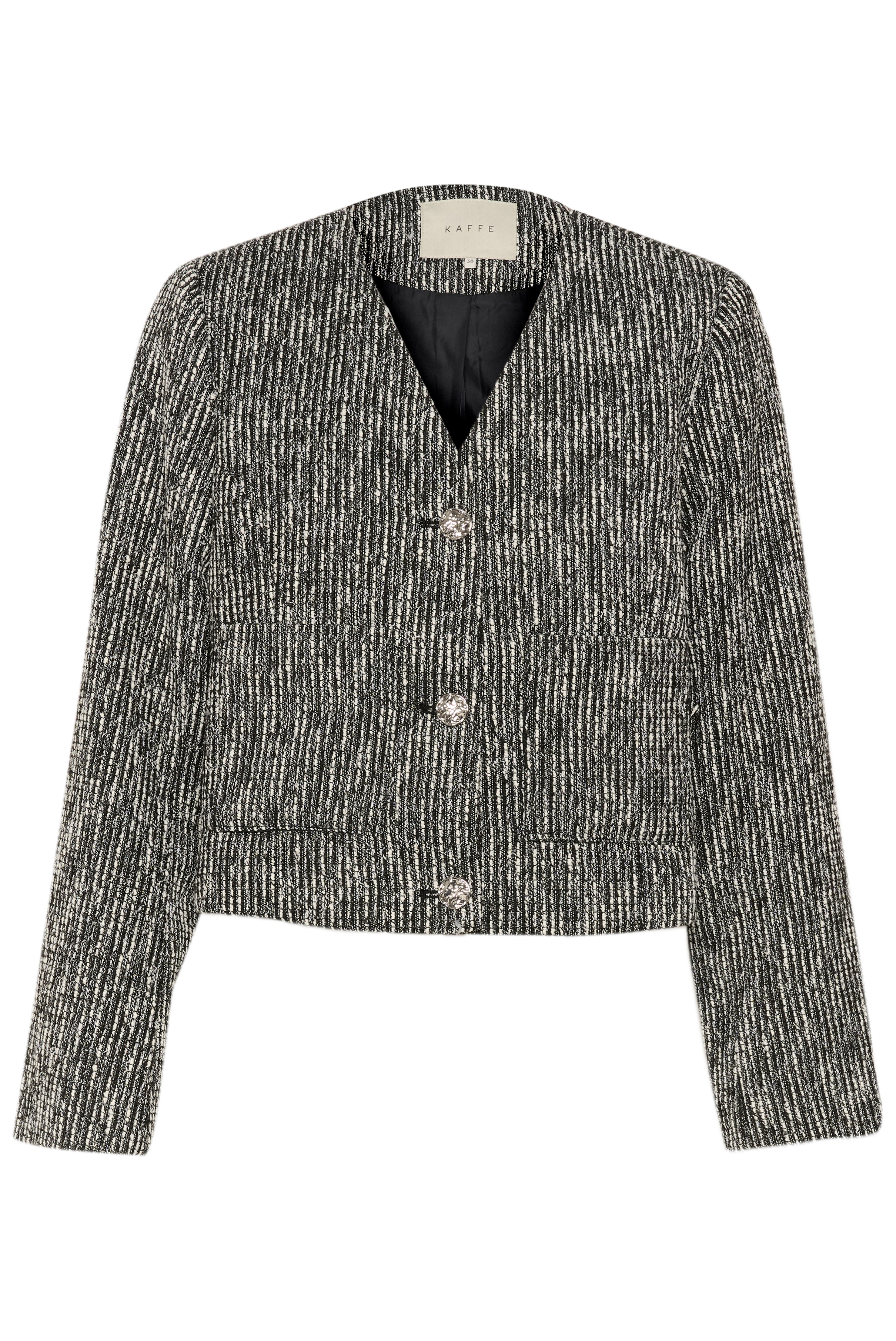 Strukturierter Blazer mit geradem Schnitt, tiefem V-Ausschnitt und langen Ärmeln. Cropped Länge und drei auffällige Knöpfe vorne.