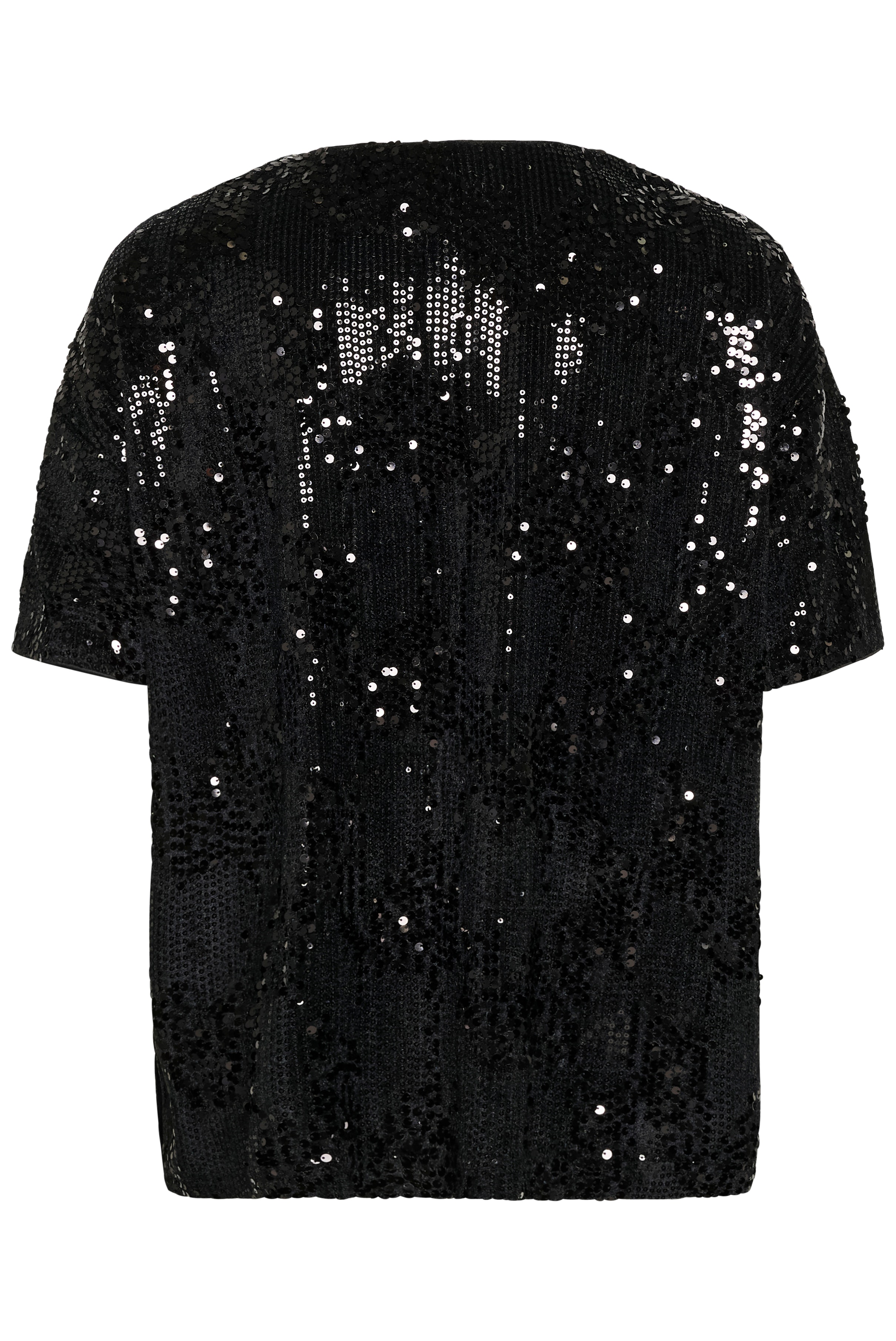 Das Paillettenshirt überzeugt mit entspannter Silhouette, tiefem V-Ausschnitt, kurzen Ärmeln und schimmernder Oberfläche. Modern und stark.