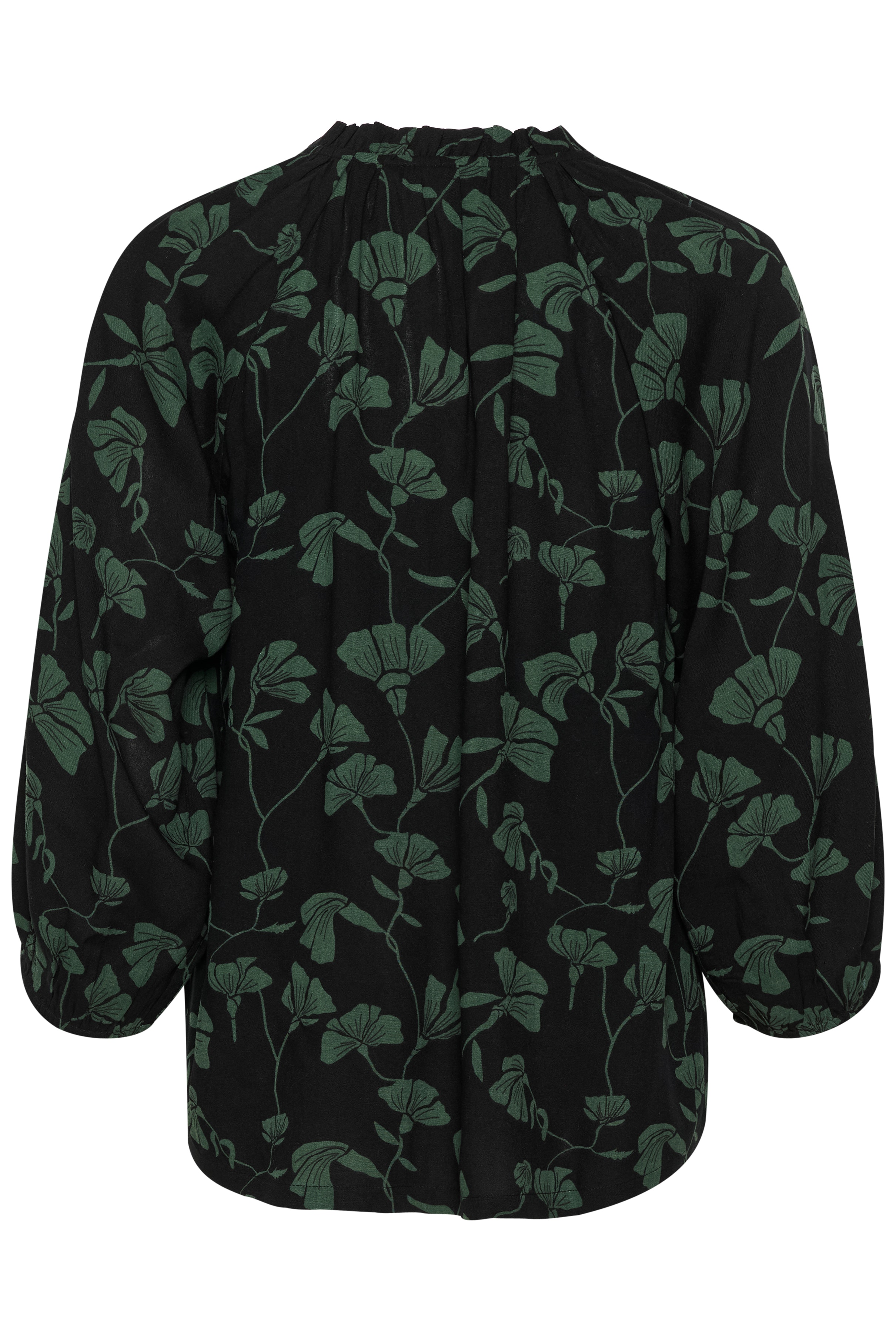 Bluse mit komplettem Print, lässigem Schnitt, V-Ausschnitt und gerafftem Kragen. 3/4-Ärmel und abgerundeter Saum sorgen für lockeren Stil.