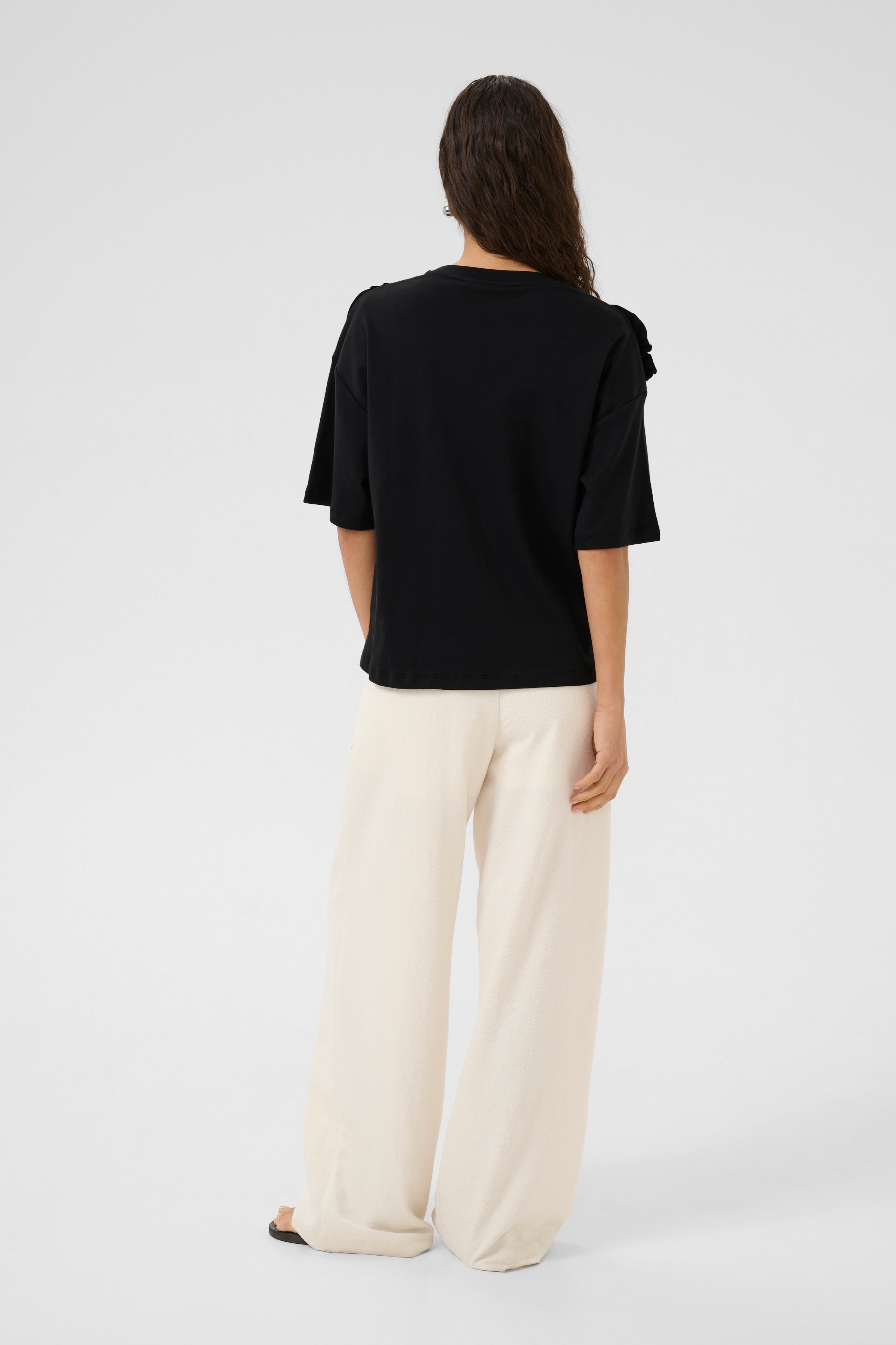 Shirt mit Rüschen-Detail, gerader Silhouette und kurzen Ärmeln. Runder Ausschnitt, strukturierte Rüsche über Brust und Schulter zieht die Blicke an.