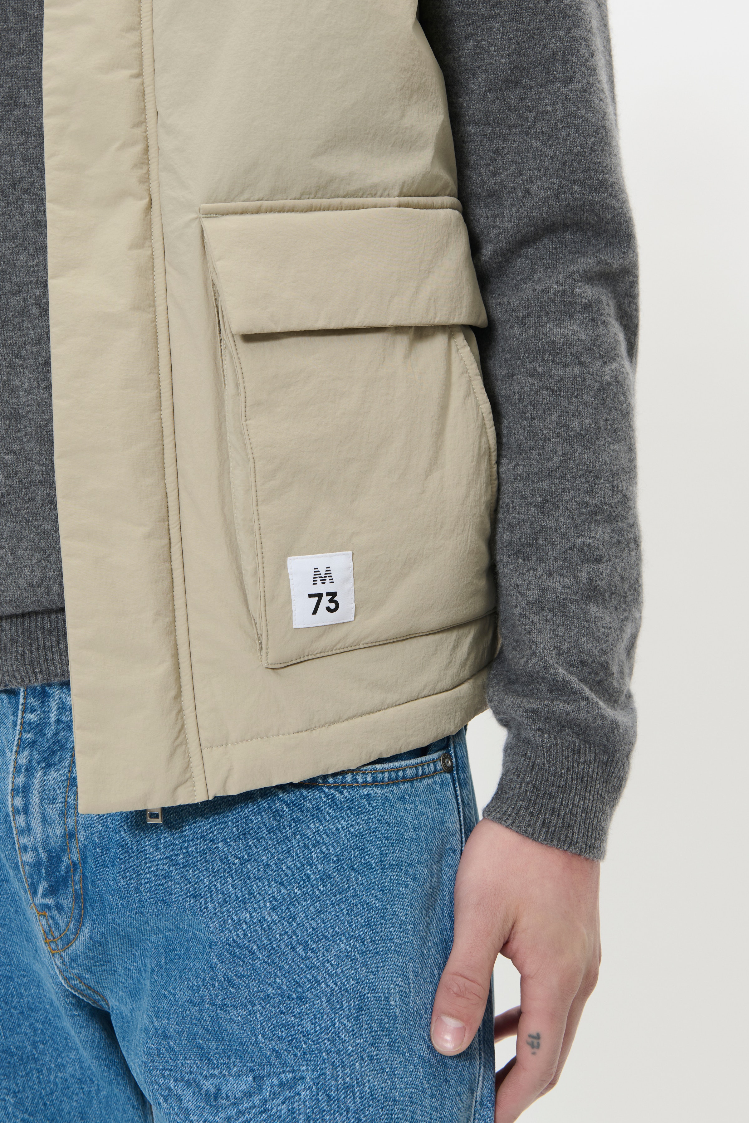 Ärmellose Weste mit geradem Schnitt und Stehkragen, glattes Finish. Vorn mit Windschutzleiste, zwei aufgesetzte Pattentaschen, dezentes Logo-Patch am Saum.