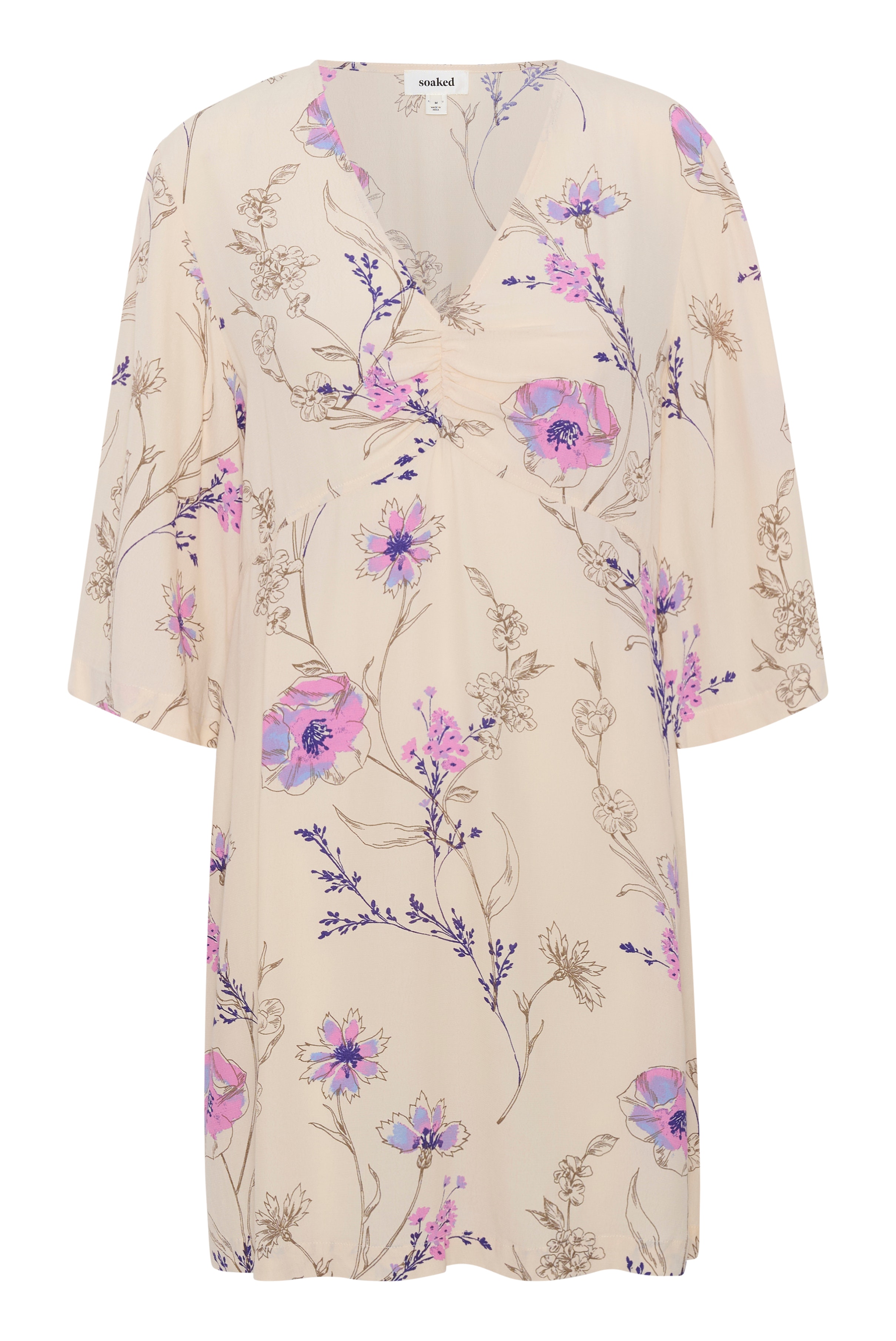 Kurzes Kleid mit femininem Blumenmuster, V-Ausschnitt und Schmetterlingsärmeln. Das Design verfügt über ein drapiertes Detail vorne, das einen eleganten und luftigen Look verleiht. Perfekt für Alltag und besondere Anlässe. Das Model ist 176 cm groß und trägt Größe M.