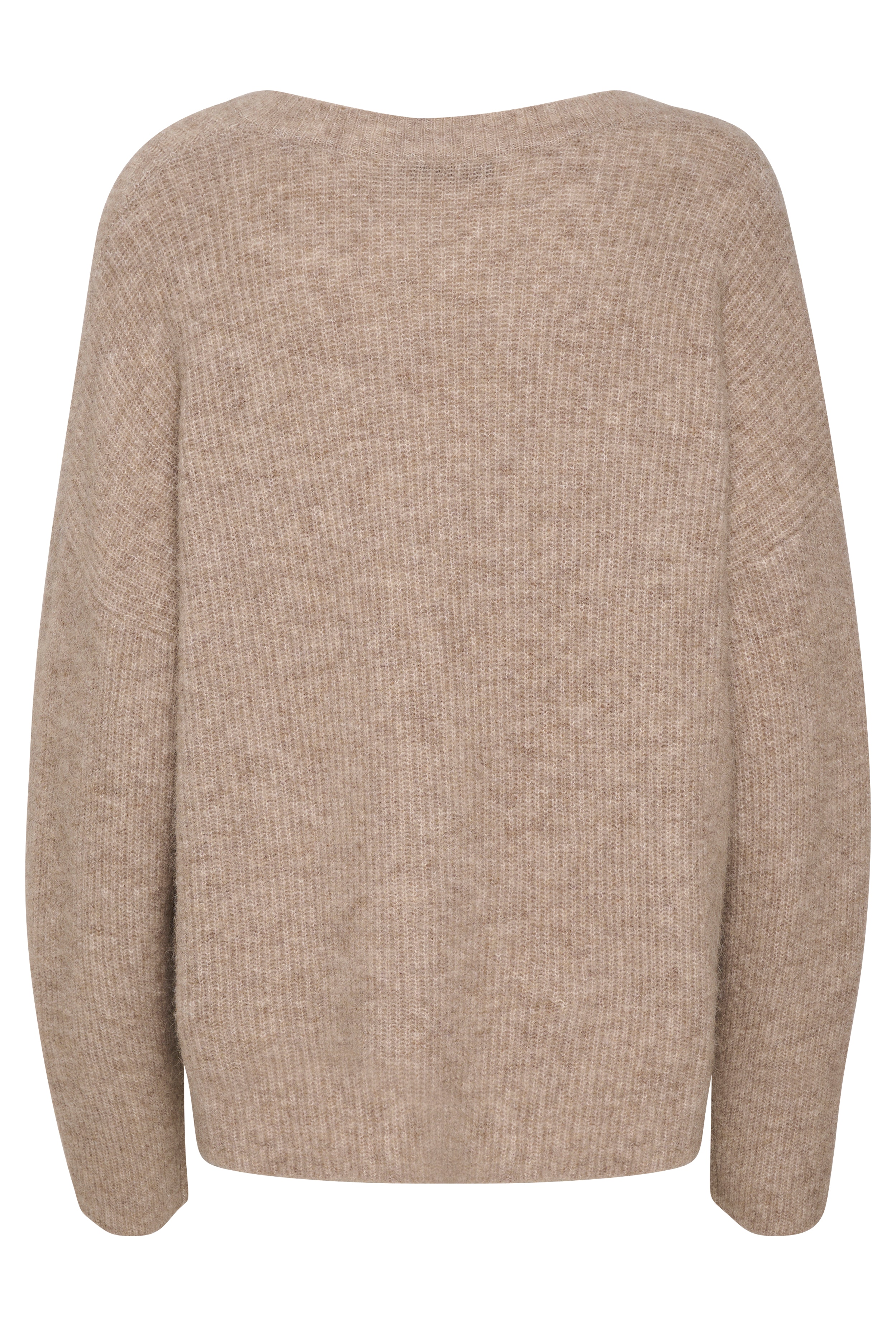 The model is 174 cm and wearing size 42/XL. A simple pullover in a rib knit that contains wool and alpaca. The pullover has an oversized fit and comes down to the hips. It has a wide V-neckline with a rib edge and wide shoulders that adds to the loose silhouette. The sleeves have added length and comes down below the wrists, and they have a straight edge.