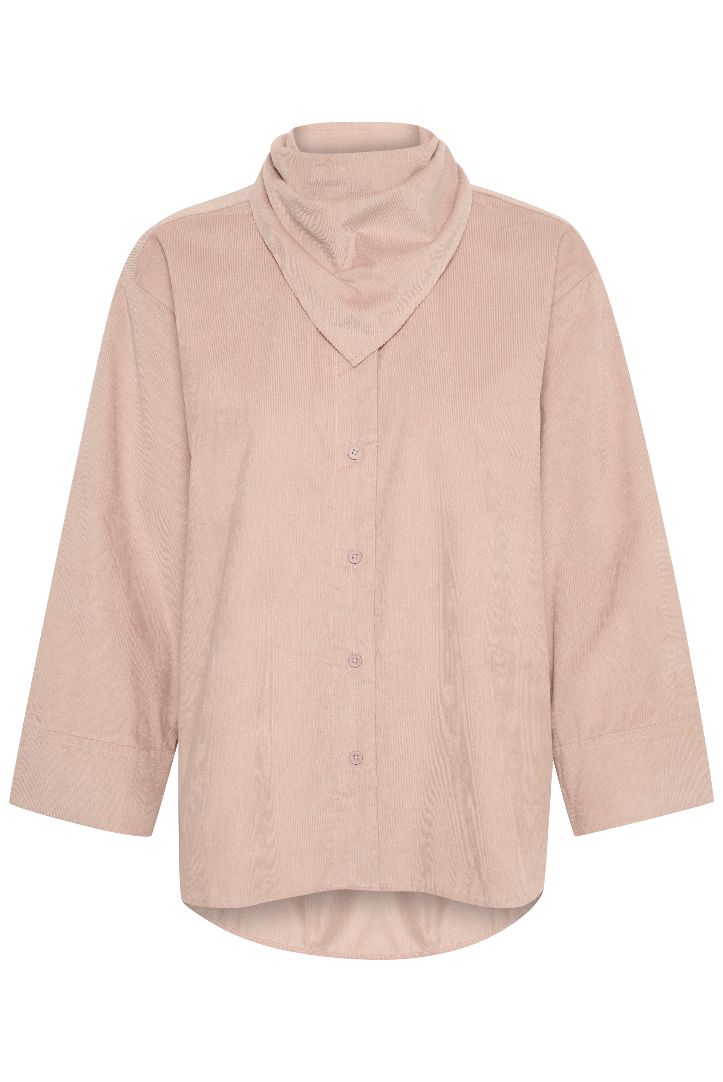 Brown shirt with long loose sleeves, a visible button closure, and a detachable scarf. The shirt has a loose fit and is made of 100% cotton. The model is 179 cm tall and is wearing size S.