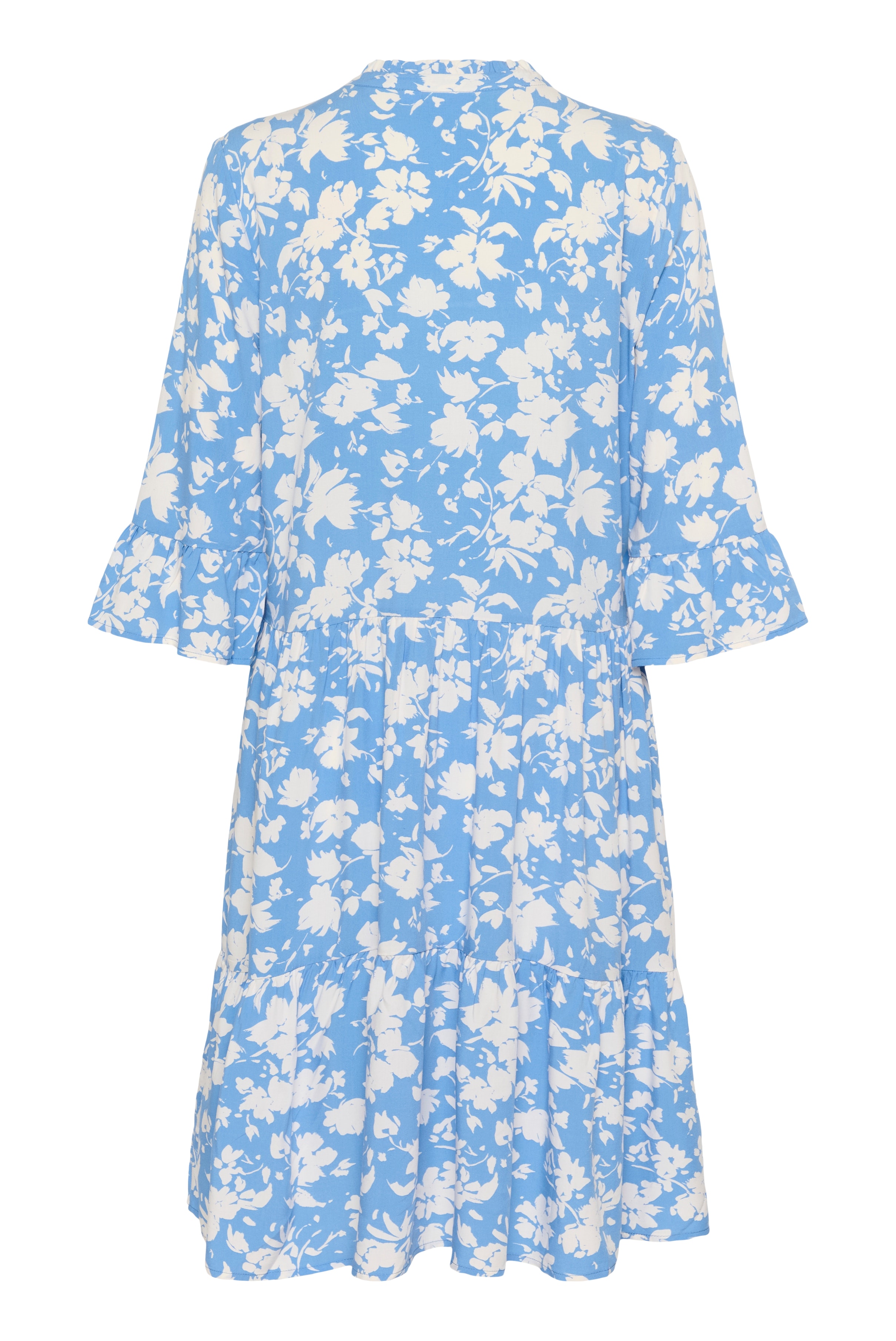 Midi dress in light blue with an all-over cream floral print. Designed with a V-neckline, 3/4 sleeves with ruffle cuffs, and a softly tiered skirt for a flowing, relaxed silhouette. Made from a lightweight woven fabric. The model is 175 cm tall and is wearing a size S.