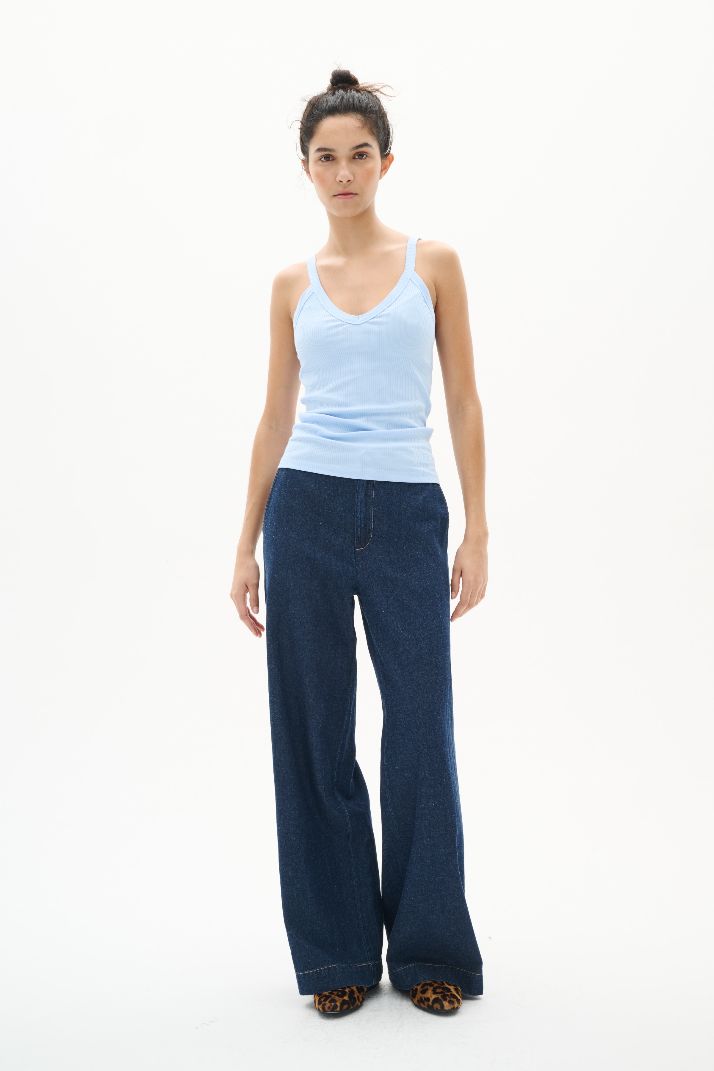 Ribbed tank top in soft, stretchy cotton in light blue. Designed with a front V-neckline, slim straps and a body-hugging fit. A feminine and comfortable style, perfect on its own or as a base layer. The model is 176 cm tall and wears size 36/S.