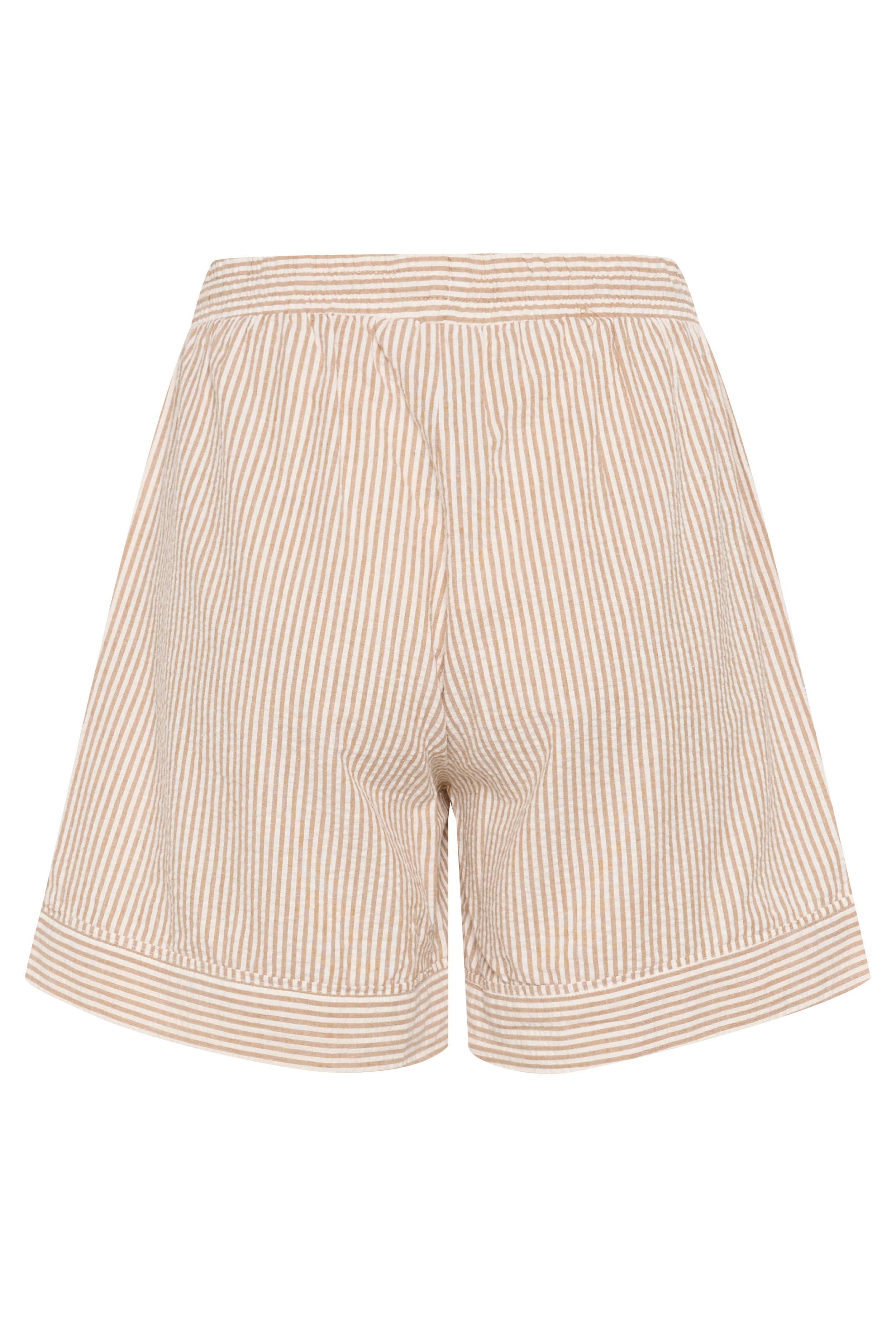 Beige and white striped shorts in a soft, lightweight fabric with a relaxed fit. Adjustable drawstring waist and folded hems. Comfortable and easy to pair with a shirt or a tee. The model is 179 cm tall and is wearing a size S.