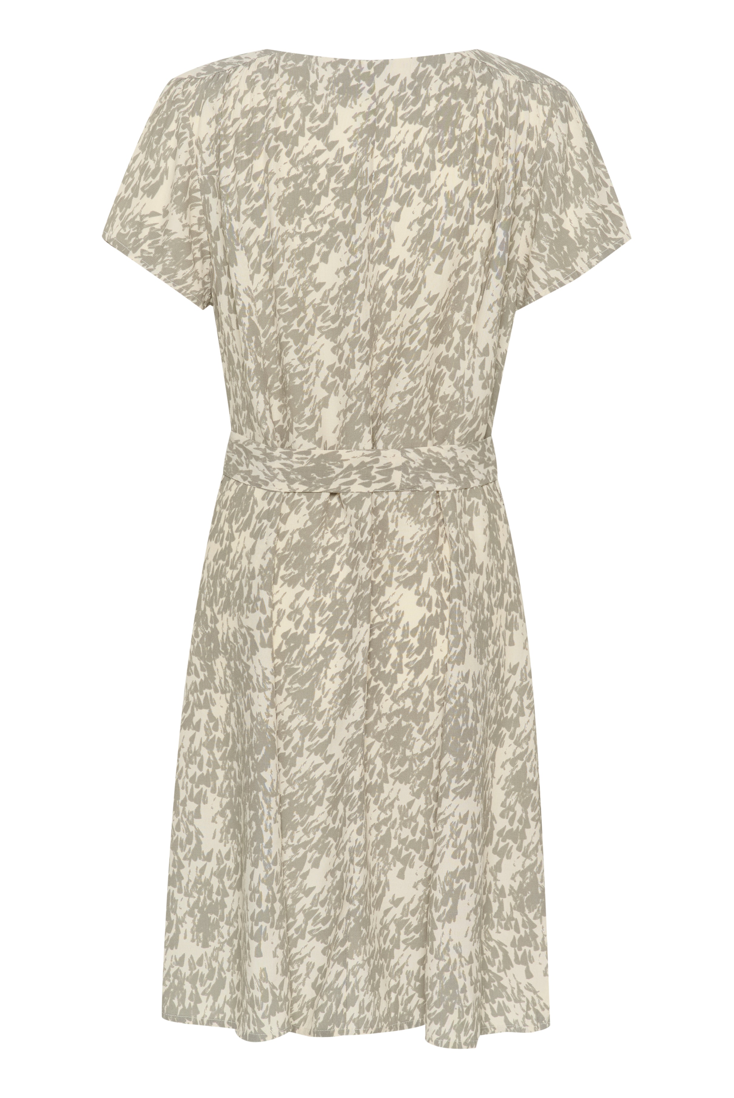 Short dress with a V-neckline and button closure down the front. The dress has short sleeves, a regular fit, and a tie belt at the waist that creates a beautiful silhouette. The model is wearing a size M.