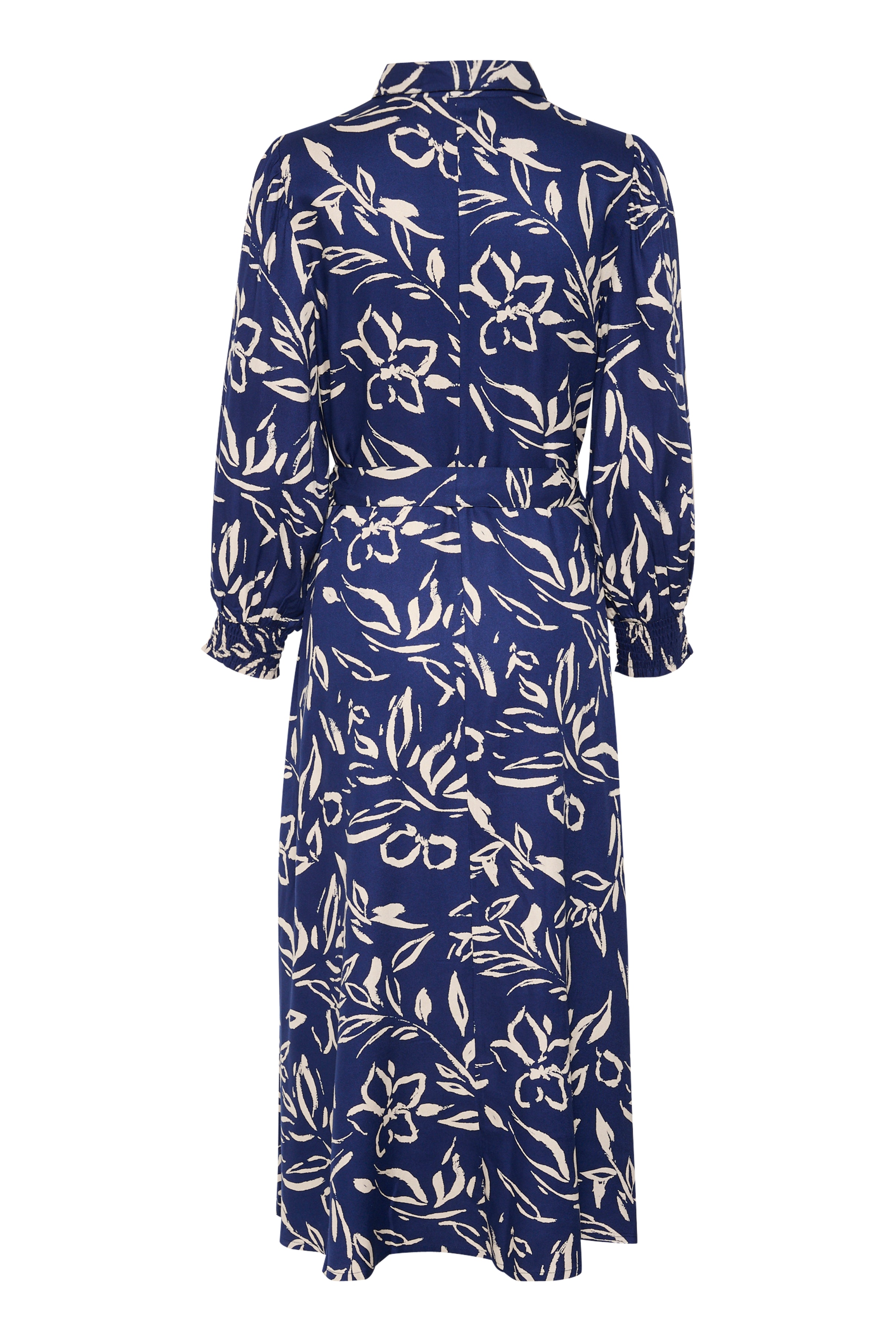 Shirt dress with a straight silhouette, midi length, and a structured collar. Features a matching tie belt, long sleeves with gathered cuffs, and all-over abstract pattern.