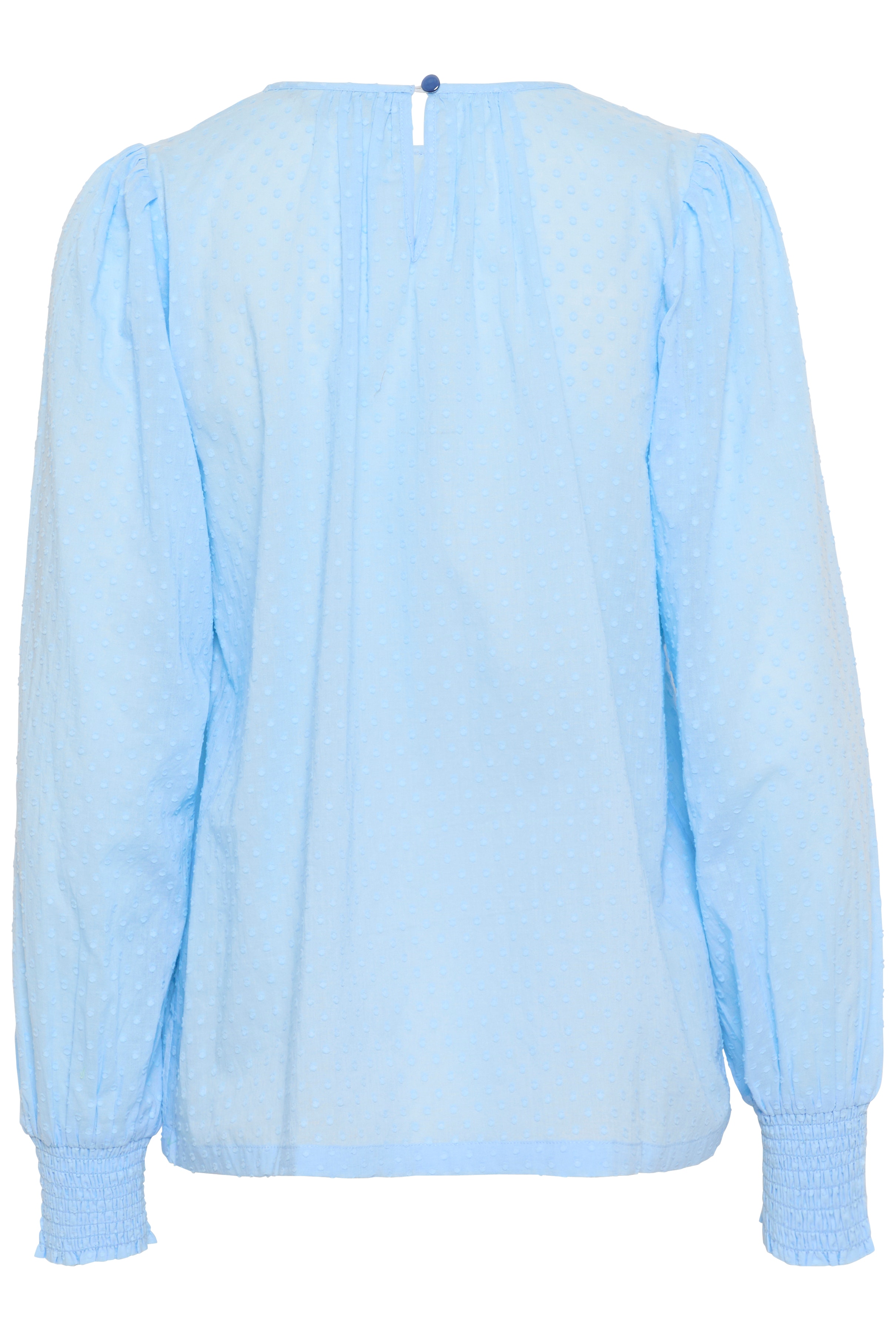 Textured blouse with subtle dot pattern, round neckline, and long balloon sleeves with wide smocked cuffs. Features a relaxed, straight silhouette and keyhole button closure at back for easy wear.