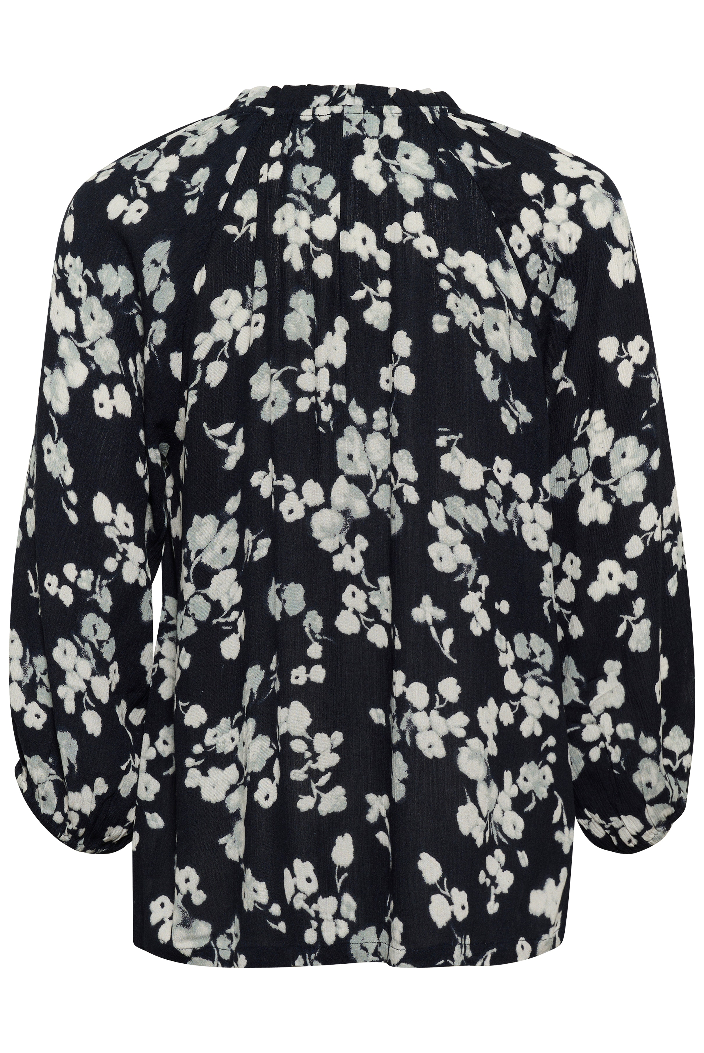 Floral blouse with a loose fit, soft-textured finish and a gently gathered v-neck. Features three-quarter sleeves and straight hem for a relaxed silhouette.