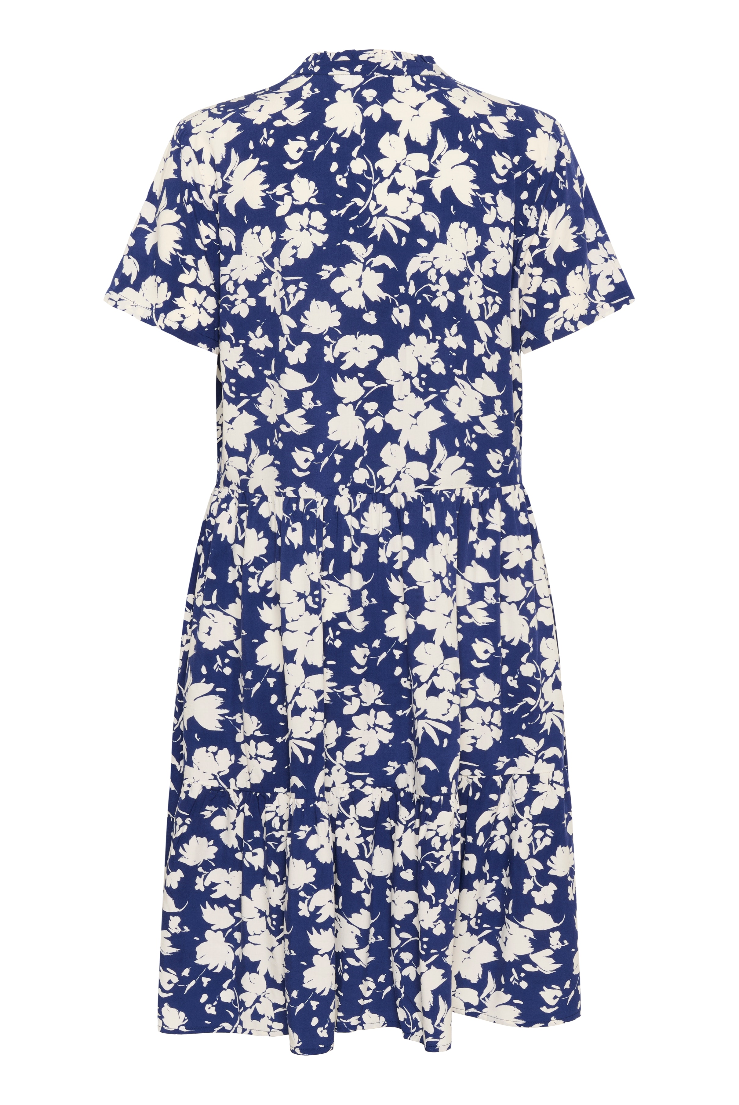 Midi dress in navy with an all-over cream floral print. Features a shirt collar, short sleeves, and a gently flared skirt for a relaxed and feminine silhouette. Made from a lightweight woven fabric. The model is 175 cm tall and is wearing a size S.