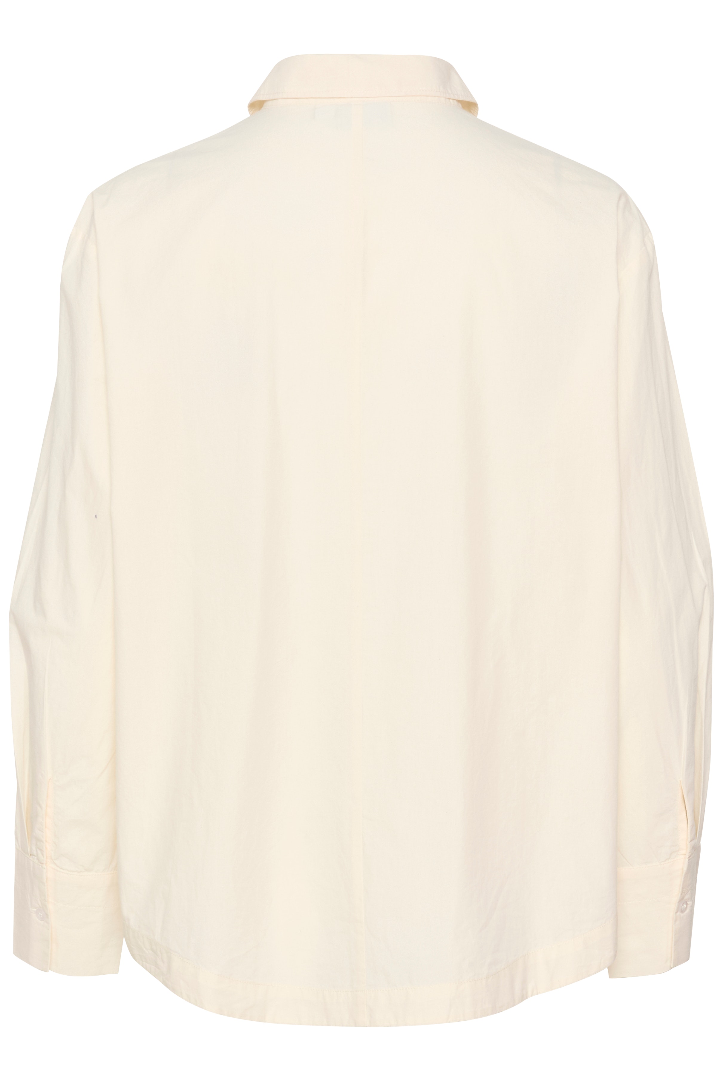White oversized shirt, classic fit, button closure at the front, and chest pocket. The model is 176 cm tall and is wearing a size M.