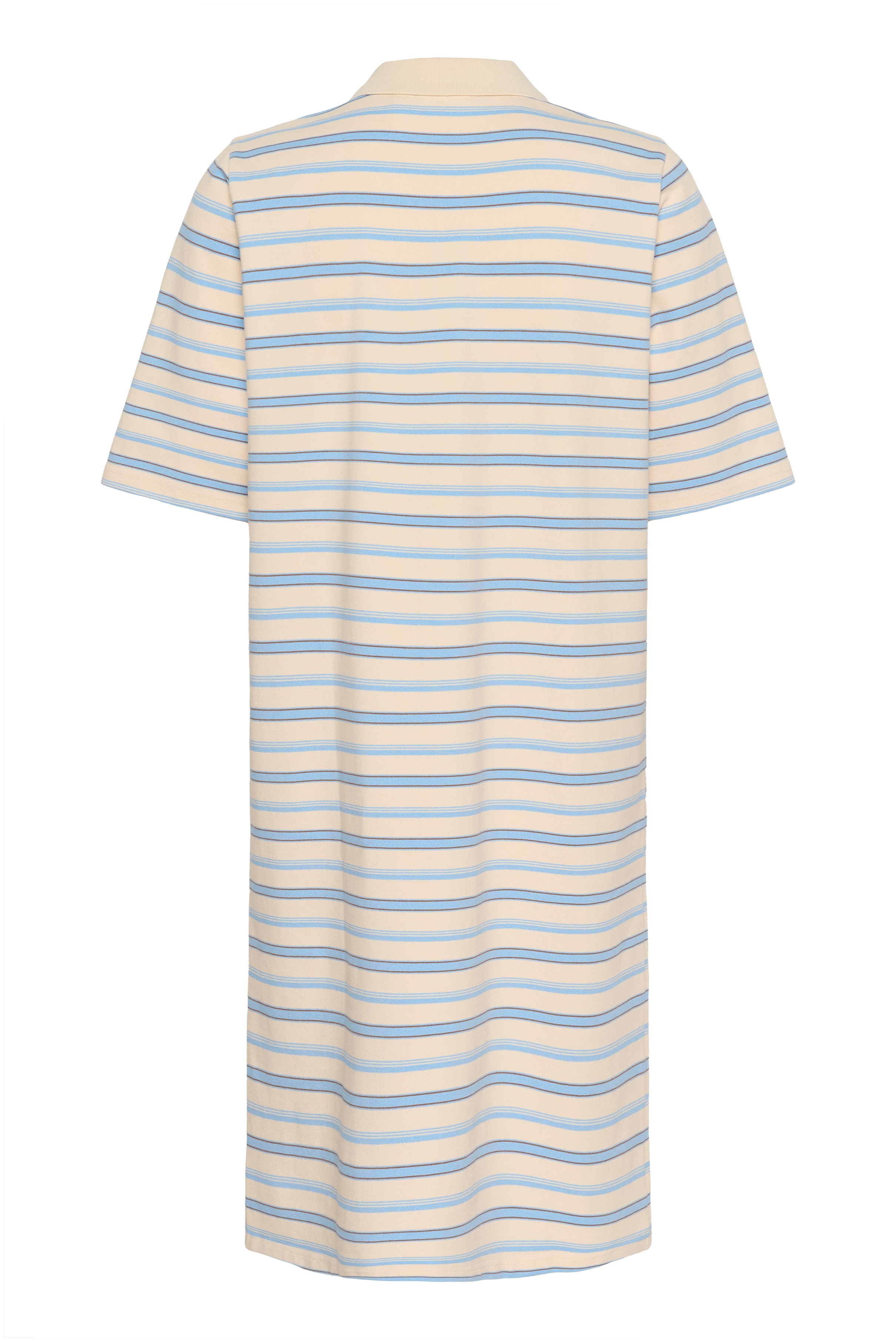 Polo dress in cream with horizontal blue and yellow stripes. Designed with a beige contrast collar, short sleeves and a straight fit. Made from soft jersey fabric for a sporty and casual look. The model is 175 cm tall and is wearing a size S.