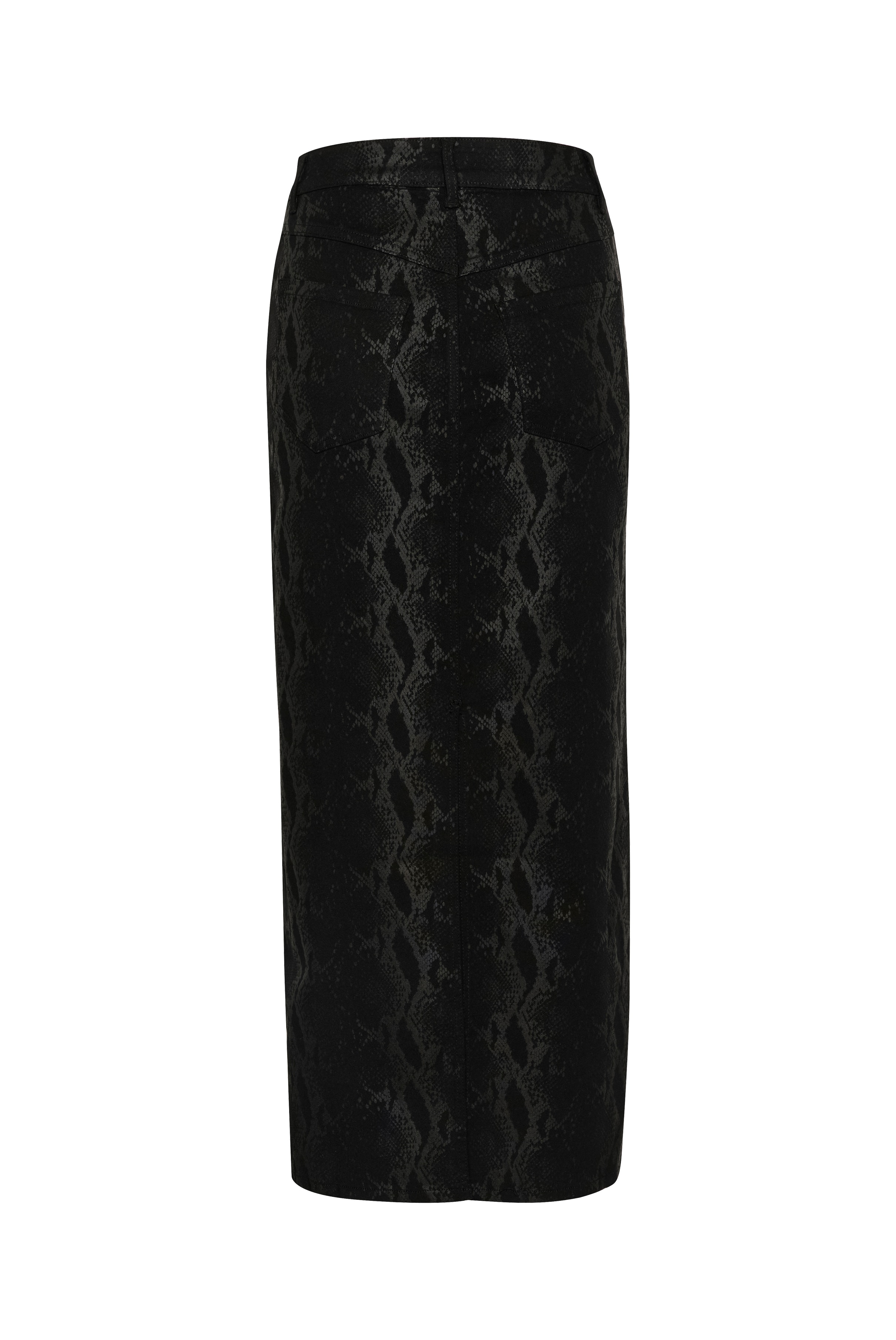 Sleek skirt with a straight, ankle-length silhouette and subtle textured finish. Fitted at the waist with classic belt loops and front button closure.