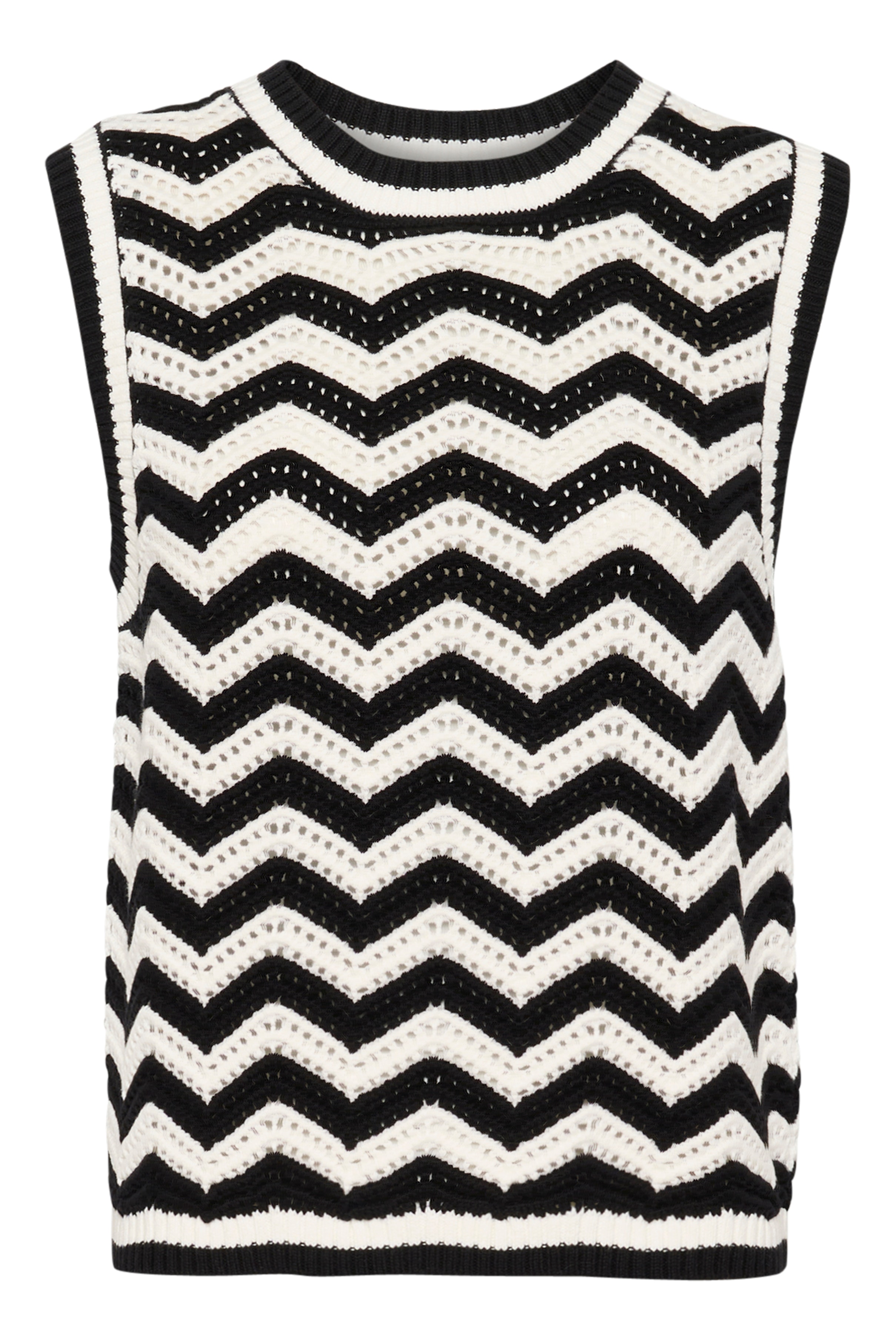 Sleeveless knit vest with bold chevron pattern, featuring a straight fit and a ribbed crew neckline. The openwork knit texture adds dimension and a cool, modern edge to this statement silhouette.