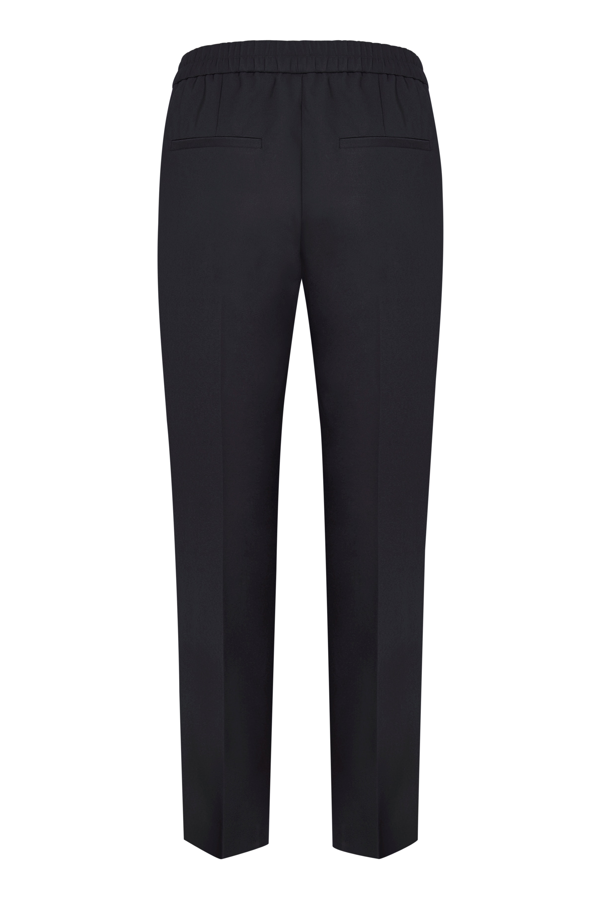 Dark blue trousers with straight legs and pressed creases. Fixed waistband at the front and elastic at the back for added comfort. Simple and timeless design. The model is 176 cm tall and wears size 36/S.