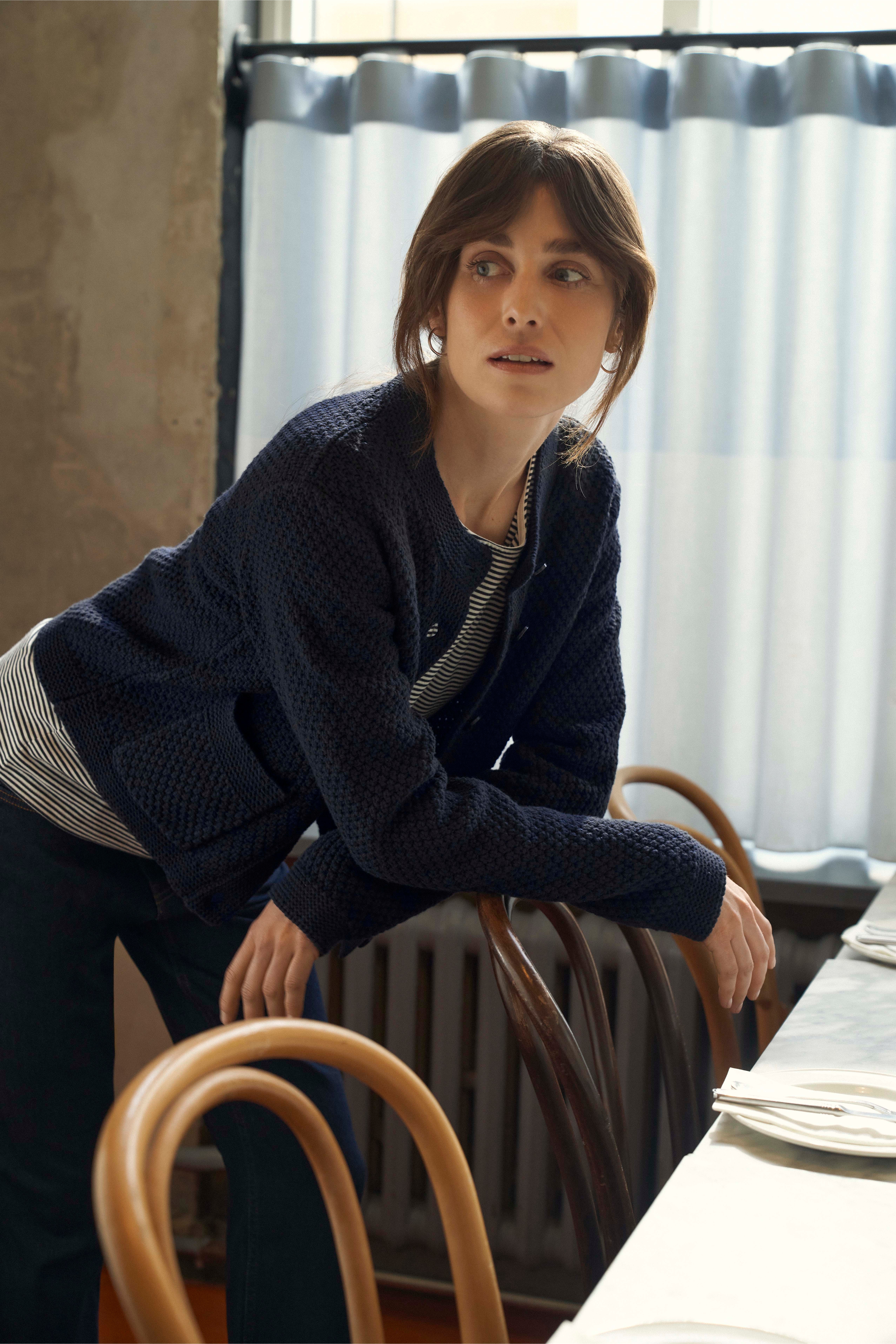 The model is 177 cm tall and wears a size M. This dark navy knitted cardigan features a rich texture and a straight, cropped fit. The large patch pockets and front button fastening add a classic yet modern touch. Wear it over a shirt or dress for a layered look suitable for both everyday and office wear.