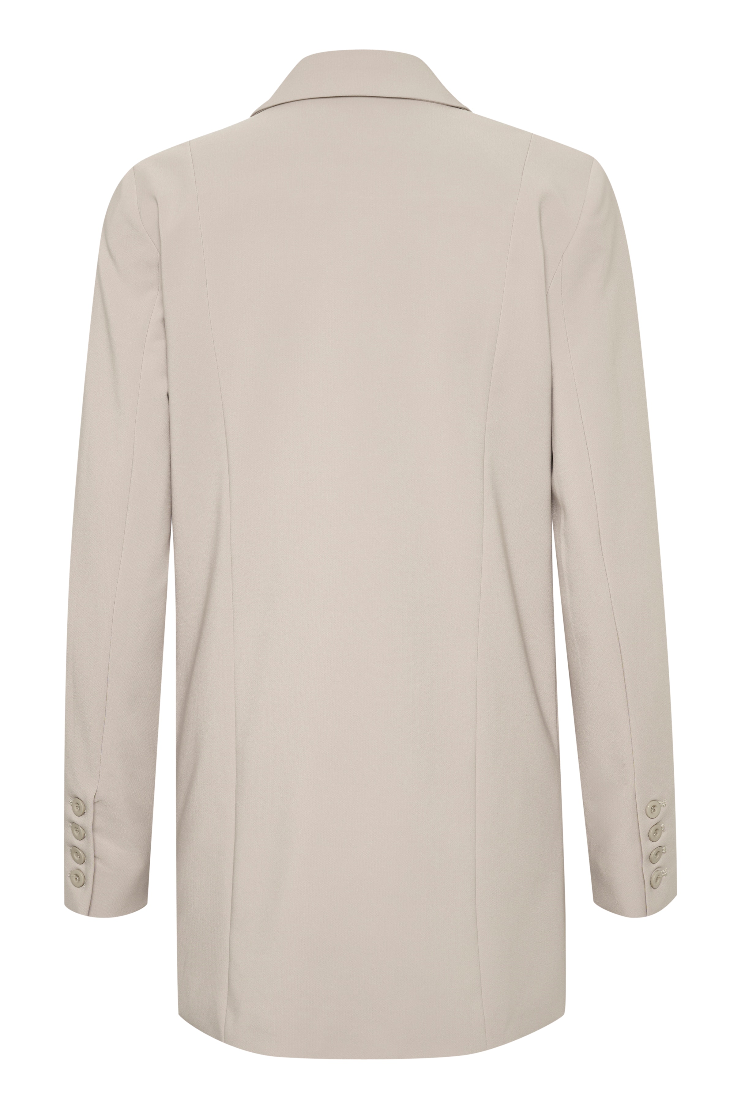 Classic double-breasted blazer with a regular fit and longline silhouette falling below the hips. Features a long notch lapel, jetted pockets, and buttoned sleeve slits. Vertical seams enhance the tailored shape. The model is 173 cm and wearing size S/36.