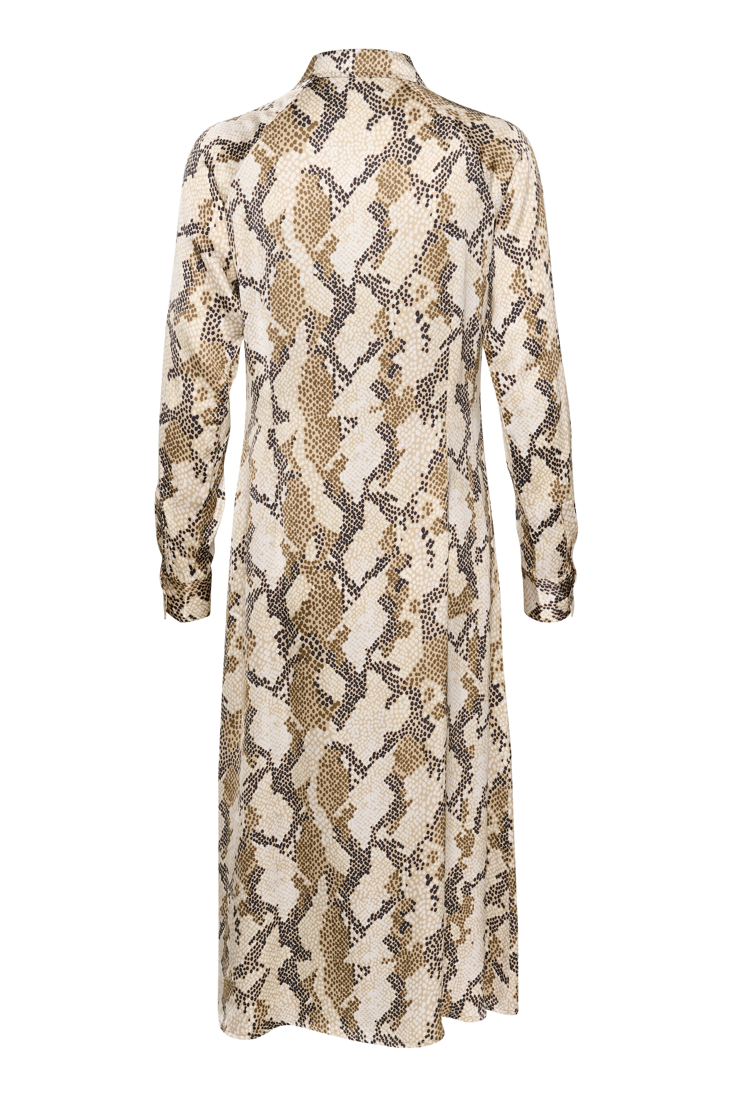 The model is 175 cm tall and is wearing a size 36. This long-sleeved snake print dress is perfect for both everyday wear and special occasions. Its soft fabric and relaxed fit ensure maximum comfort all day long. Pair it with sneakers for a casual look or heels for a more elegant expression.