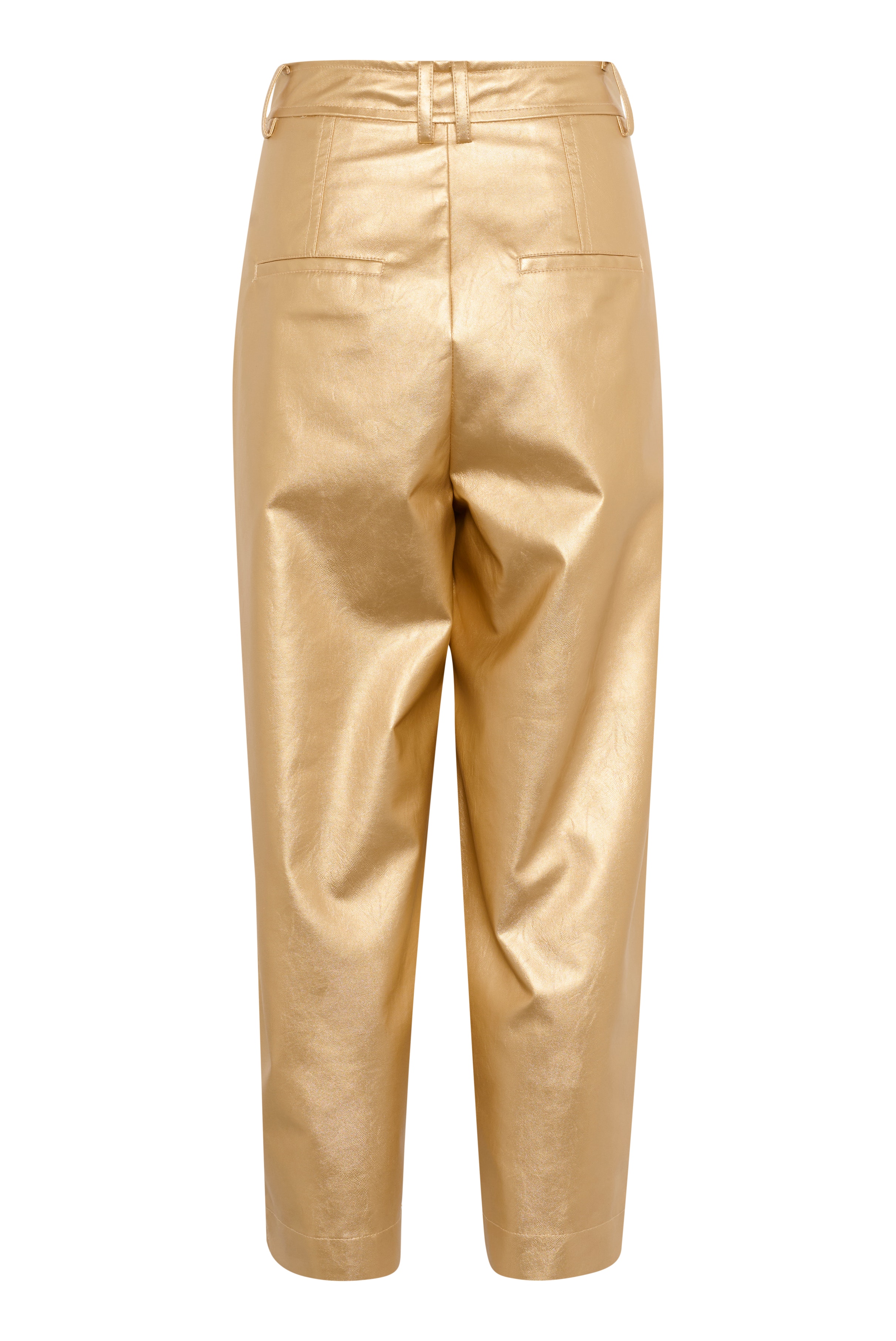 Statement trousers in a metallic gold finish with a barrel-leg silhouette. Designed with a high waist, pleated details, and discreet side pockets. Complete with belt loops and a concealed zip closure for a polished touch. The model is 176 cm tall and wears size 36/S.
