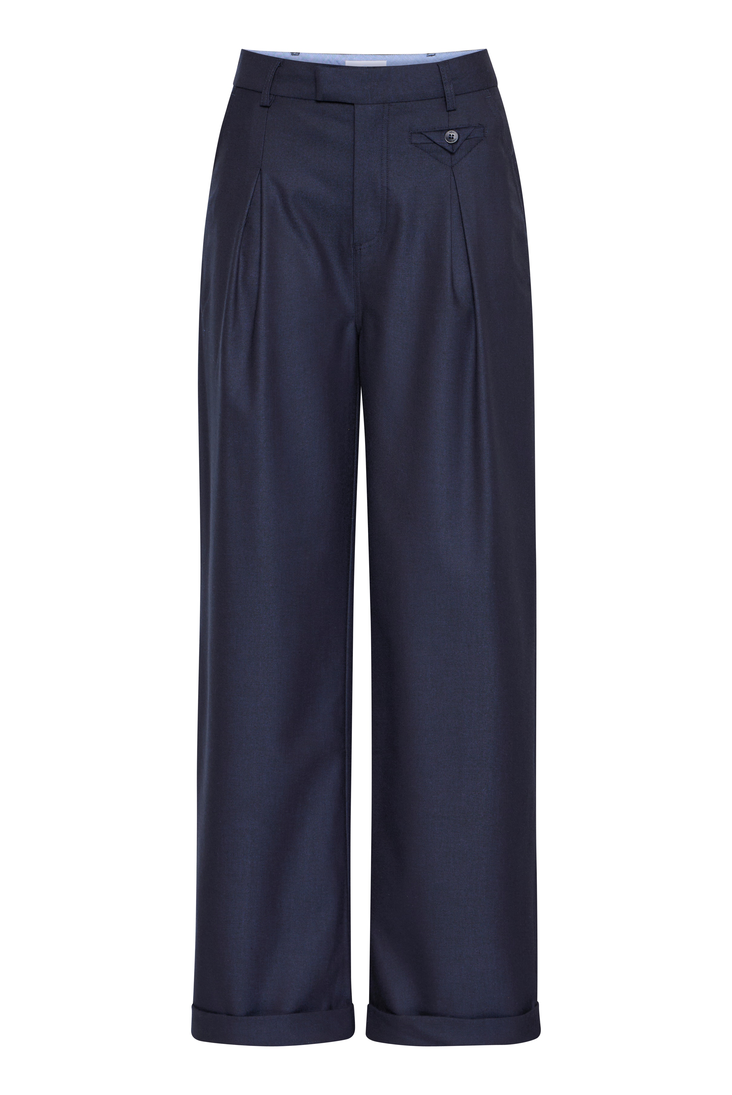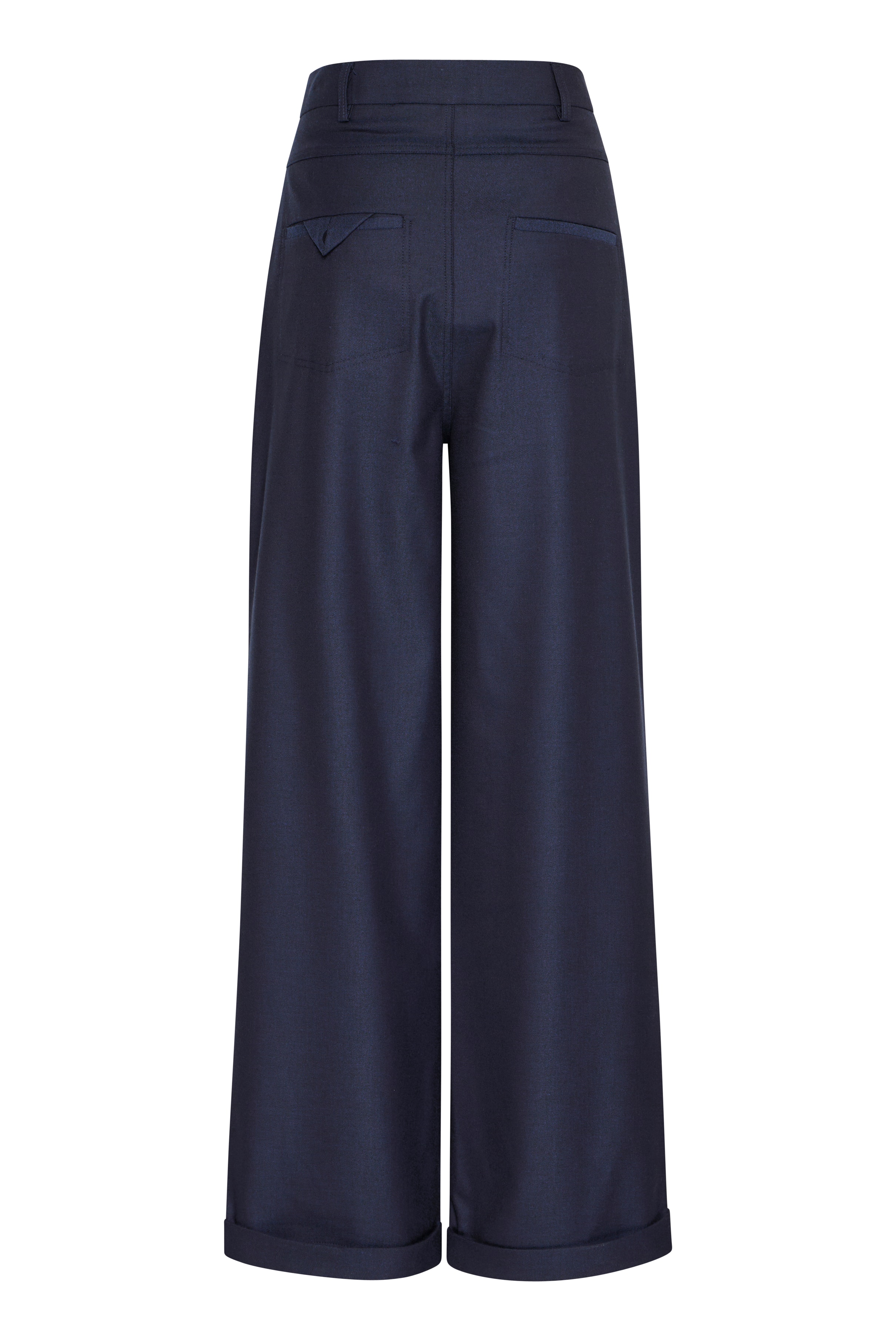 Wide-leg tailored trousers with a soft finish feature pleats, a high waist, and a turn-up hem. Defined by a relaxed, straight silhouette and a flap pocket accent.