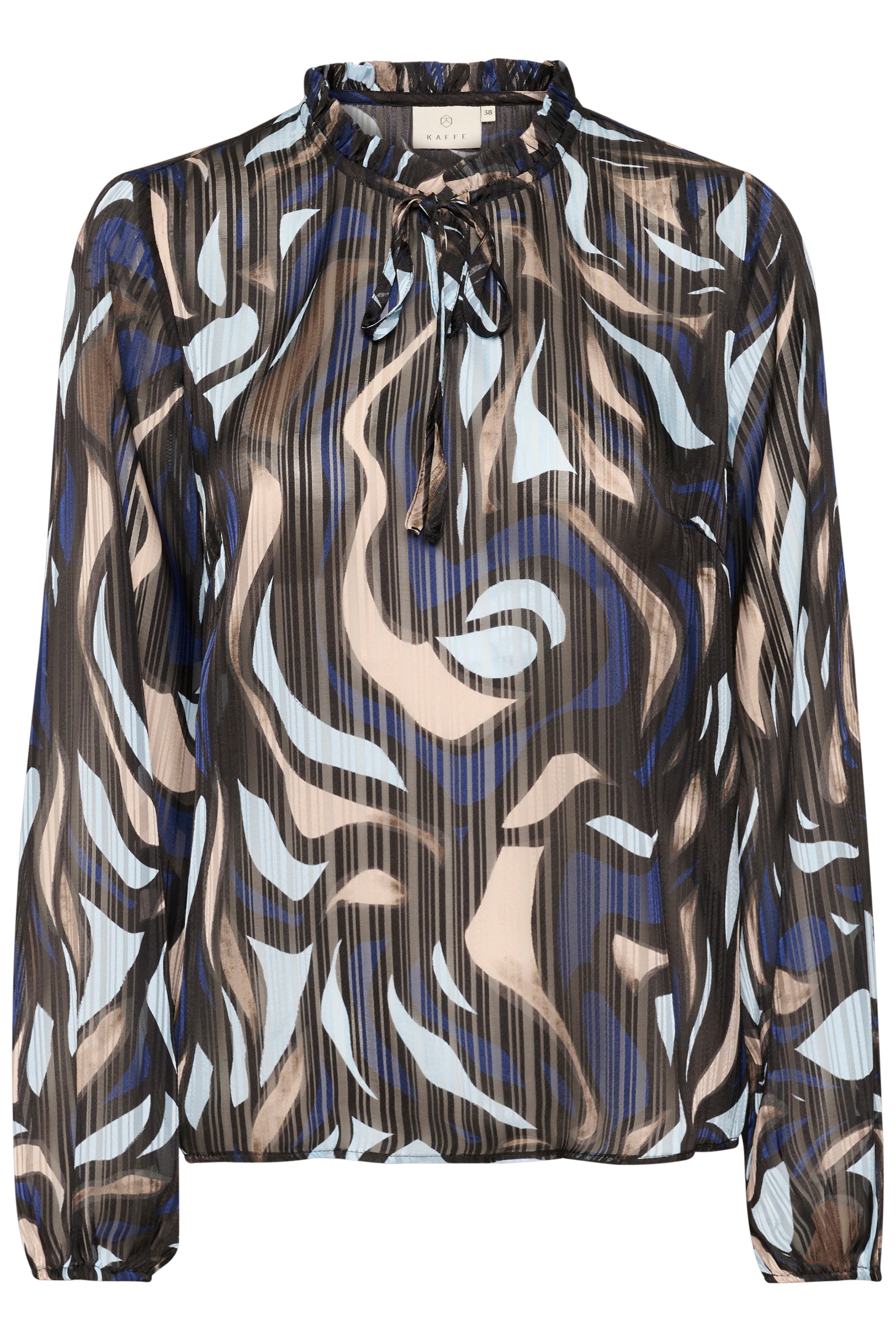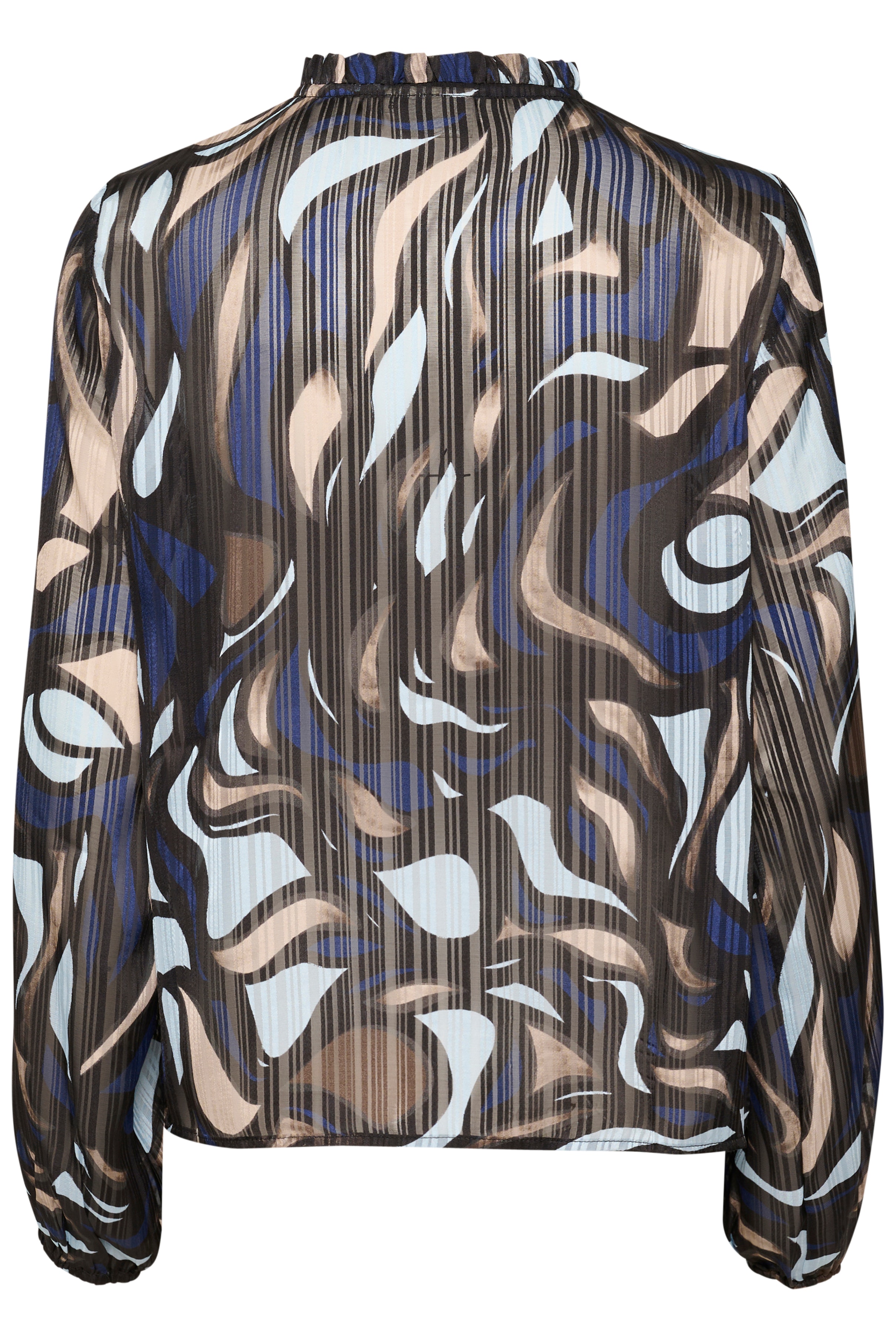 Sheer blouse with a bold abstract design, featuring a straight silhouette, long sleeves with elastic cuffs, and a ruffled stand collar with front tie detail.