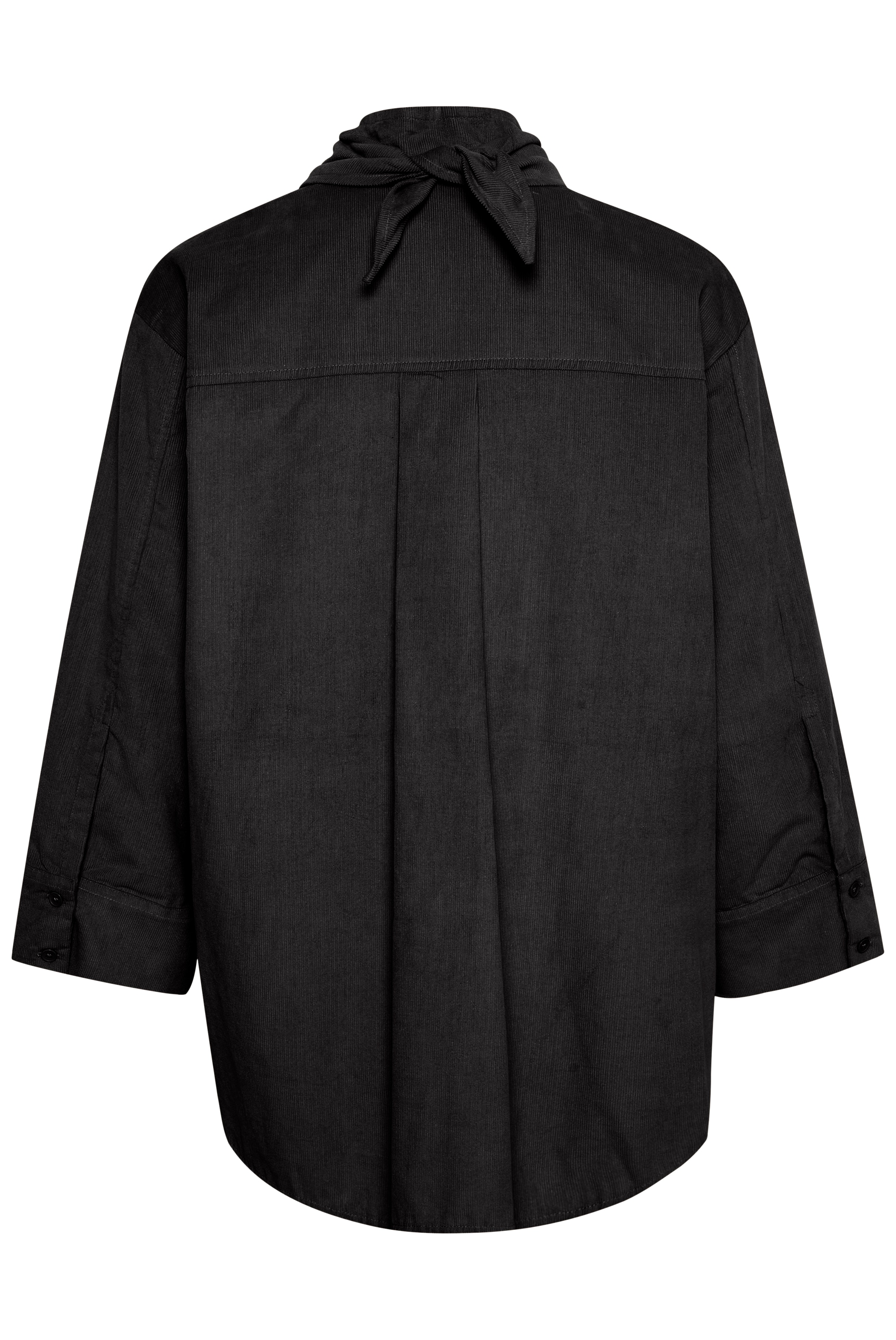 Zwarte blouse met lange losse mouwen, een zichtbare knoopsluiting en een afneembaar sjaaltje. De blouse heeft een losse pasvorm en is gemaakt van 100% katoen. Het model is 179 cm lang en draagt maat S.